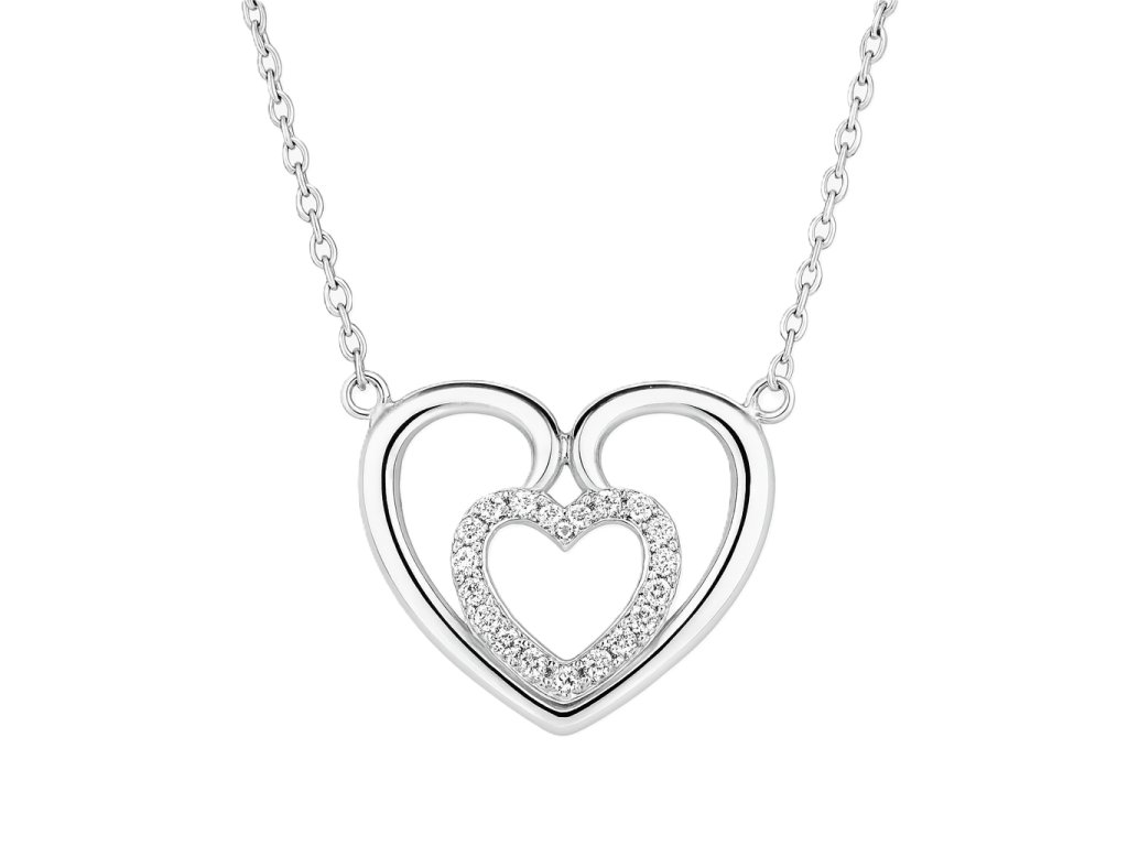 Amoris Duo je strieborný náhrdelník 925 s rhódiovou úpravou, ktorý spája dve srdcia do jedného elegantného šperku. Vnútorné srdce zdobené zirkónmi žiari ako symbol lásky, vonkajší obrys tvorí nežné objatie.