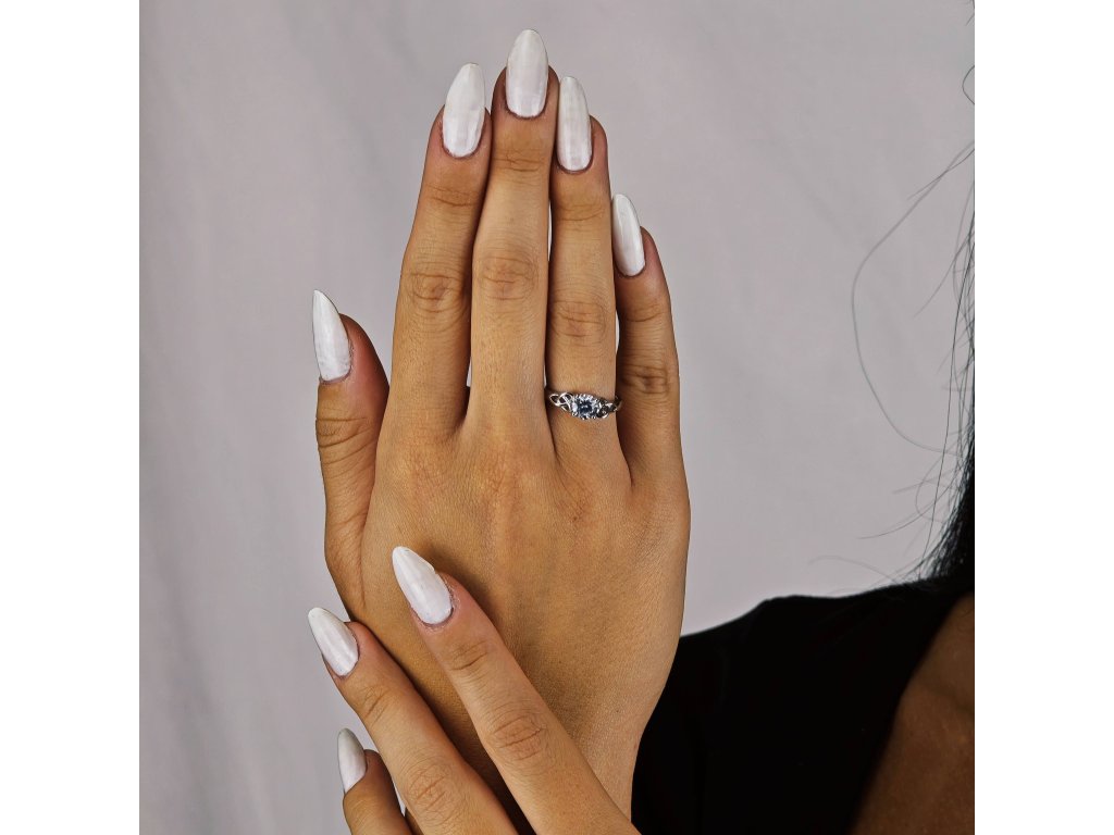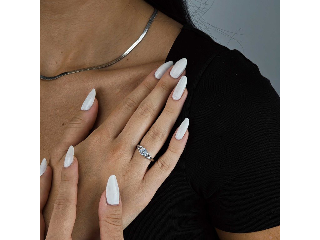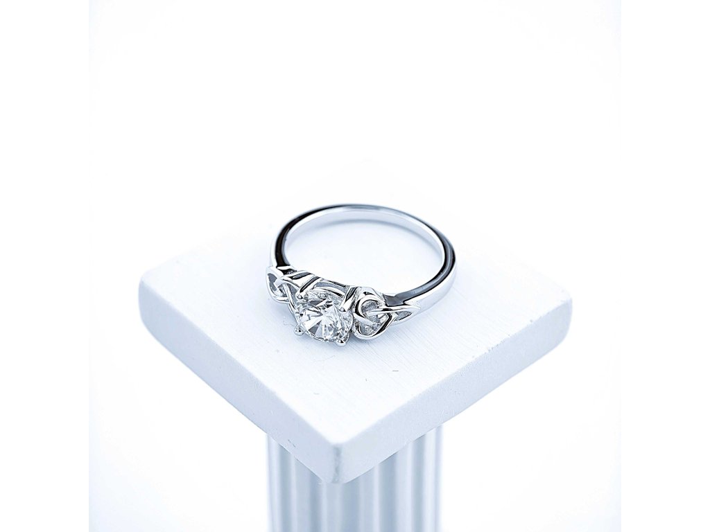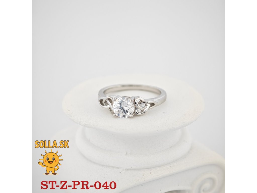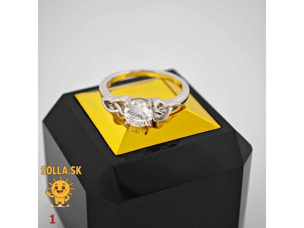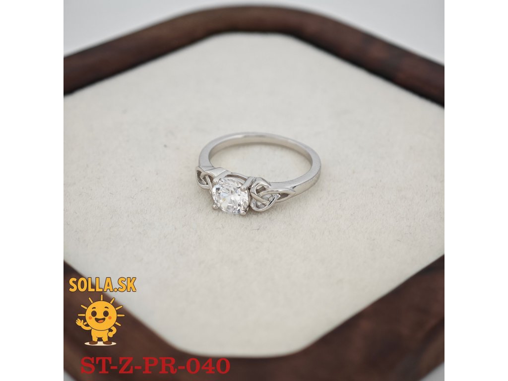 Dominantou prsteňa je brilantne brúsený švajčiarsky zirkón, ktorého jas a čistota pripomínajú hviezdu žiariacu na nočnej oblohe. Po bokoch ho dopĺňa jemný dekoratívny motív uzla – symbol večnosti, spojenia duší a harmónie.
