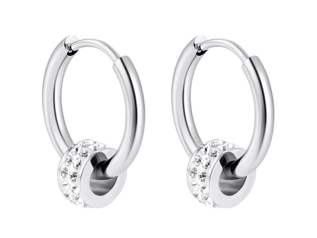 Leštený povrch ocele zvýrazňuje hladké kontúry kruhu, zatiaľ čo číre kryštály dodávajú náušniciam svetelný akcent. Kombinácia kovu a kryštálov pôsobí vyvážene a umožňuje jednoduché kombinovanie s rôznymi štýlmi oblečenia.