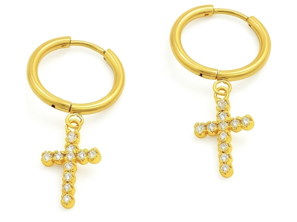 Elegantné zlaté náušnice s krížikom osadeným zirkónmi, ktoré zachytávajú svetlo a symbolizujú vieru, silu a vnútorný pokoj.