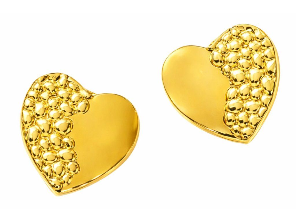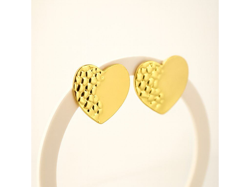 Jedna polovica srdca je zdobená jemnou reliéfnou textúrou, zatiaľ čo druhá zostáva hladká a leštená. Tento kontrast vytvára zaujímavý svetelný efekt a zvýrazňuje tvar náušníc bez potreby ďalších ozdobných prvkov.
