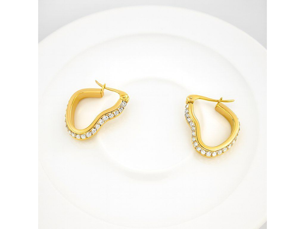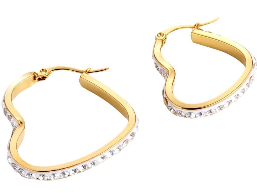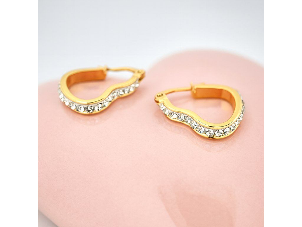 Elegantné pozlátené náušnice z chirurgickej ocele v tvare srdca, zdobené radom trblietavých zirkónov.