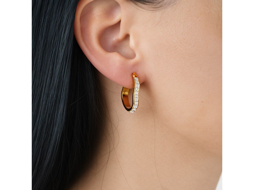 Leštený zlatý povrch zvýrazňuje tvar náušníc a dodáva im čistý, elegantný vzhľad. Číre zirkóny sú osadené pozdĺž obrysu srdca a pri dopade svetla vytvárajú jemný svetelný efekt. Dizajn pôsobí decentne a ľahko sa kombinuje s rôznymi štýlmi oblečenia.