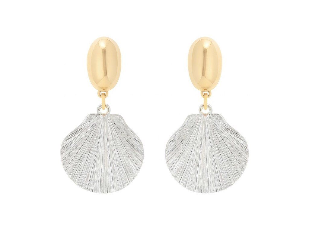 Bikolórne náušnice s motívom mušle – zlatený vrch, strieborný prívesok. Elegantné, ľahké a hypoalergénne.