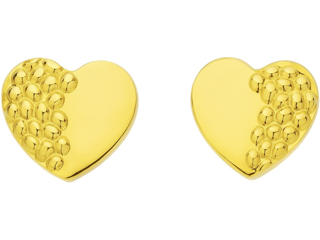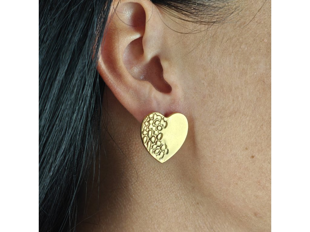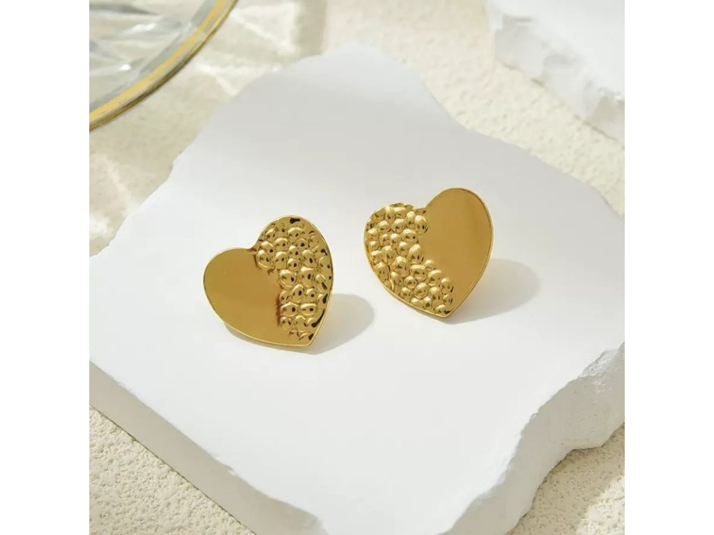 Elegantné zlaté náušnice v tvare srdca z chirurgickej ocele, ozdobené jemným reliéfom pre jedinečný lesk.