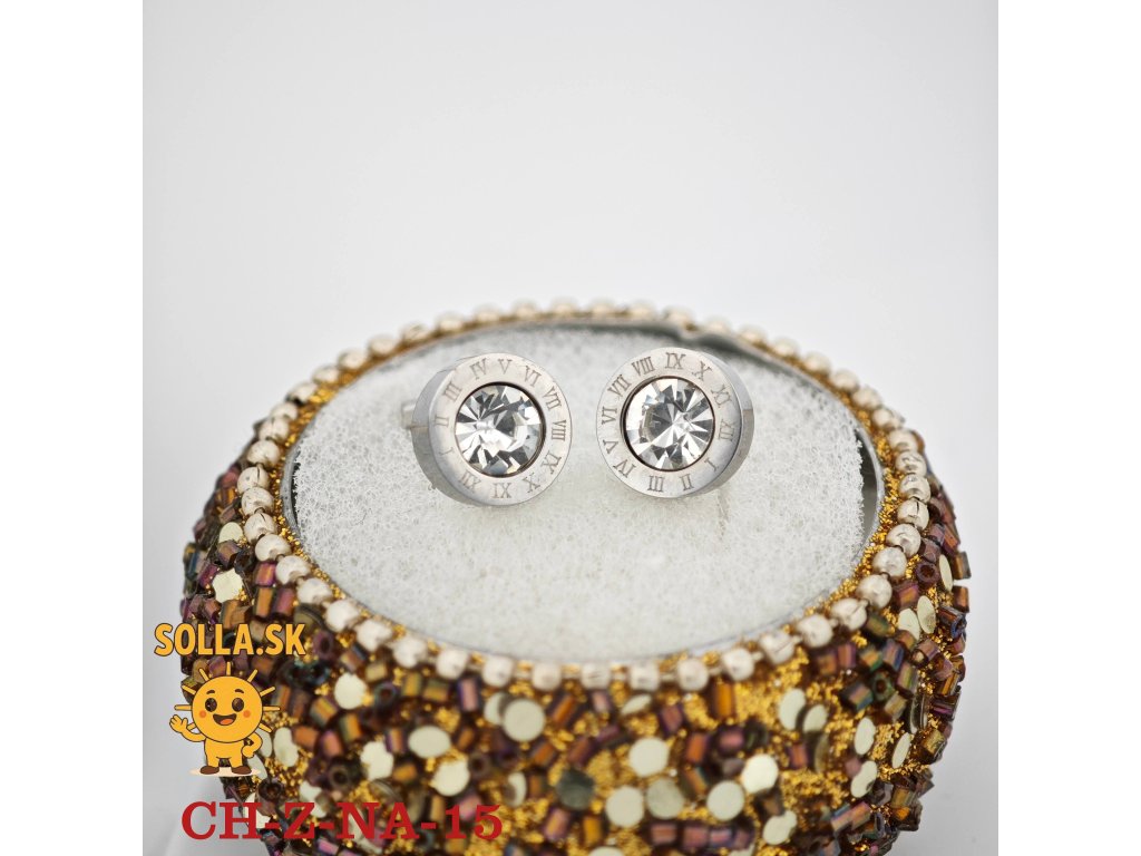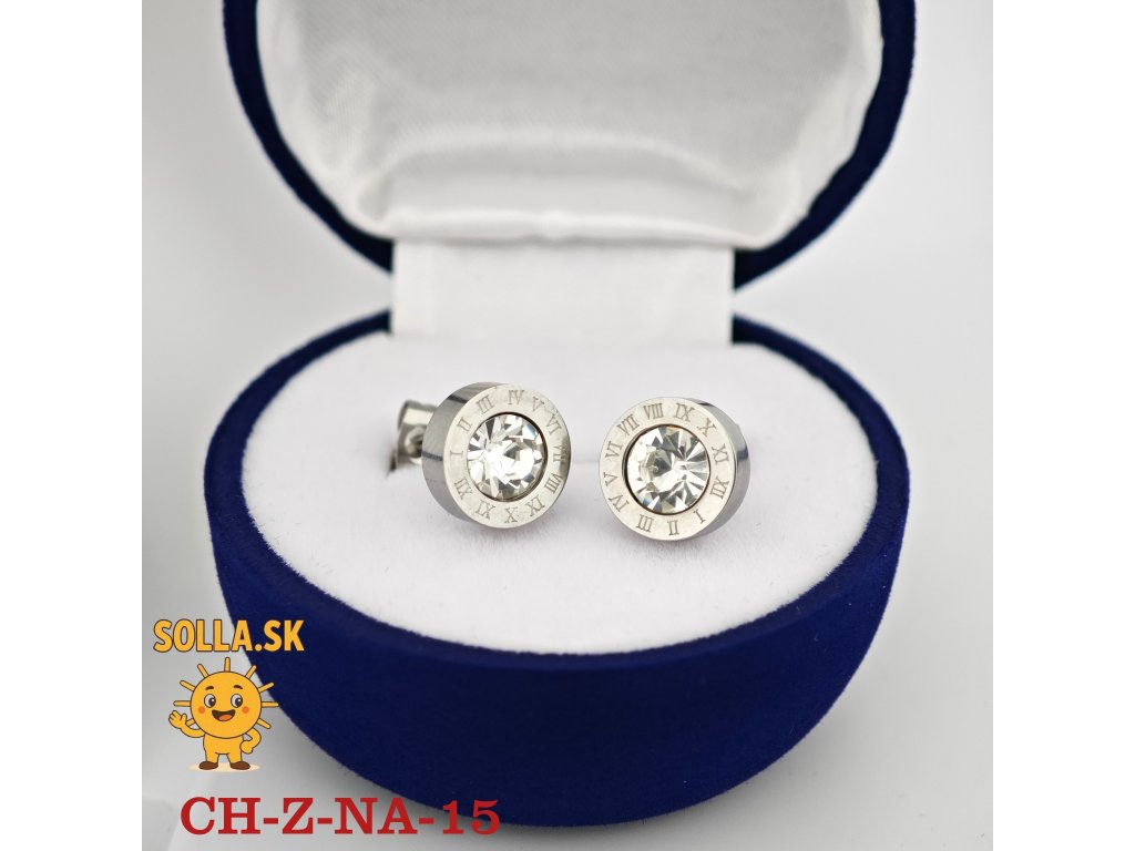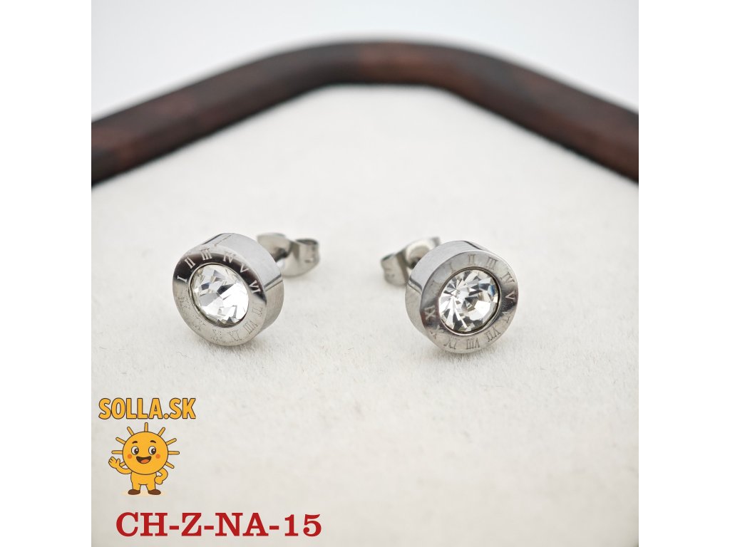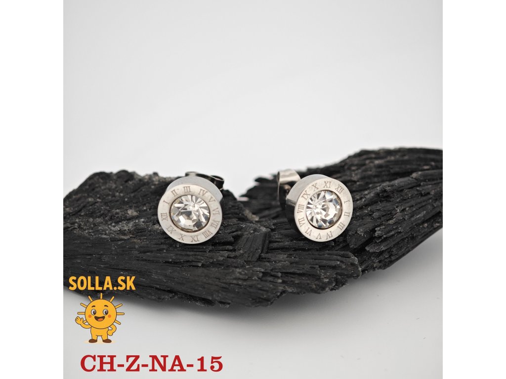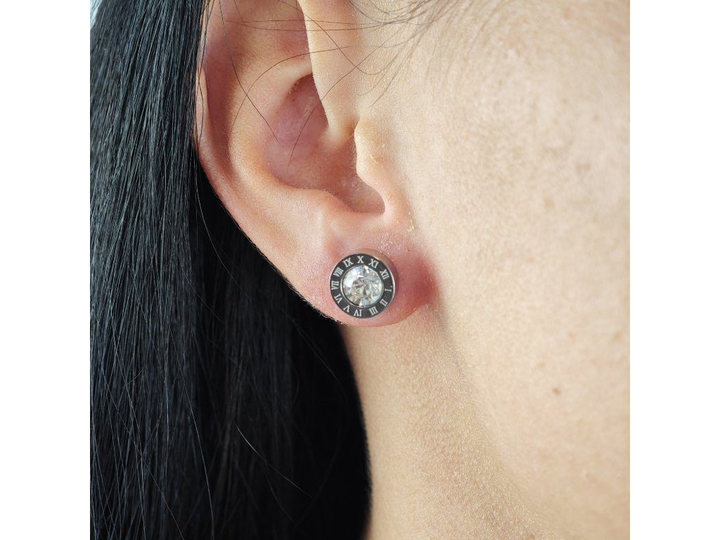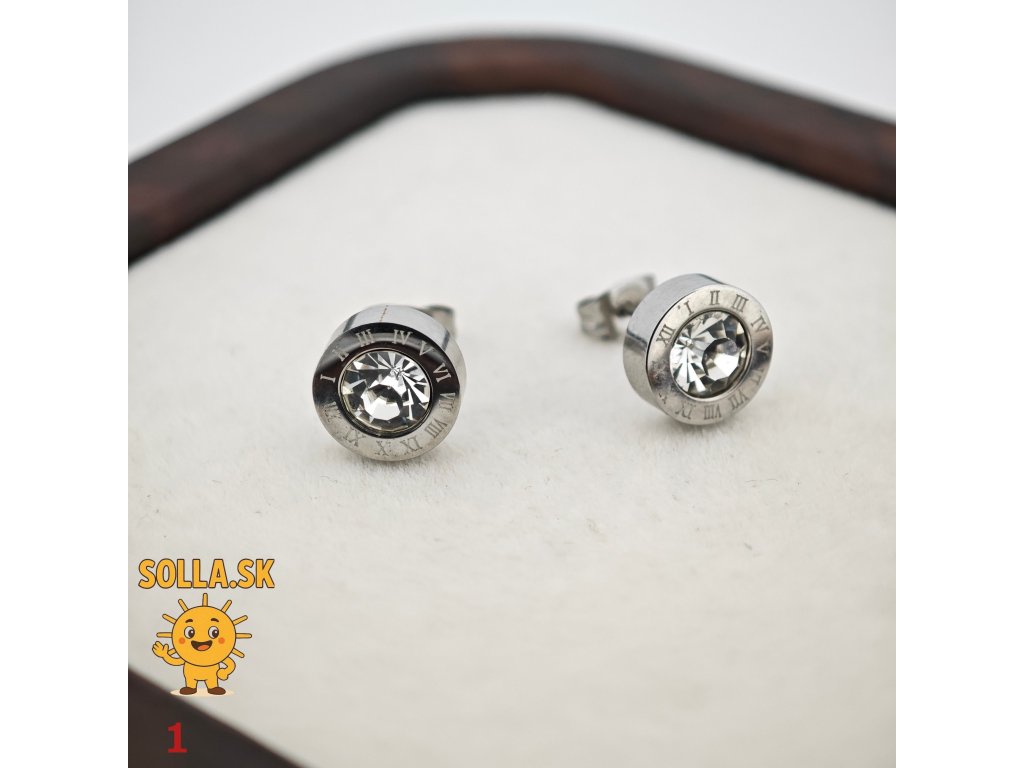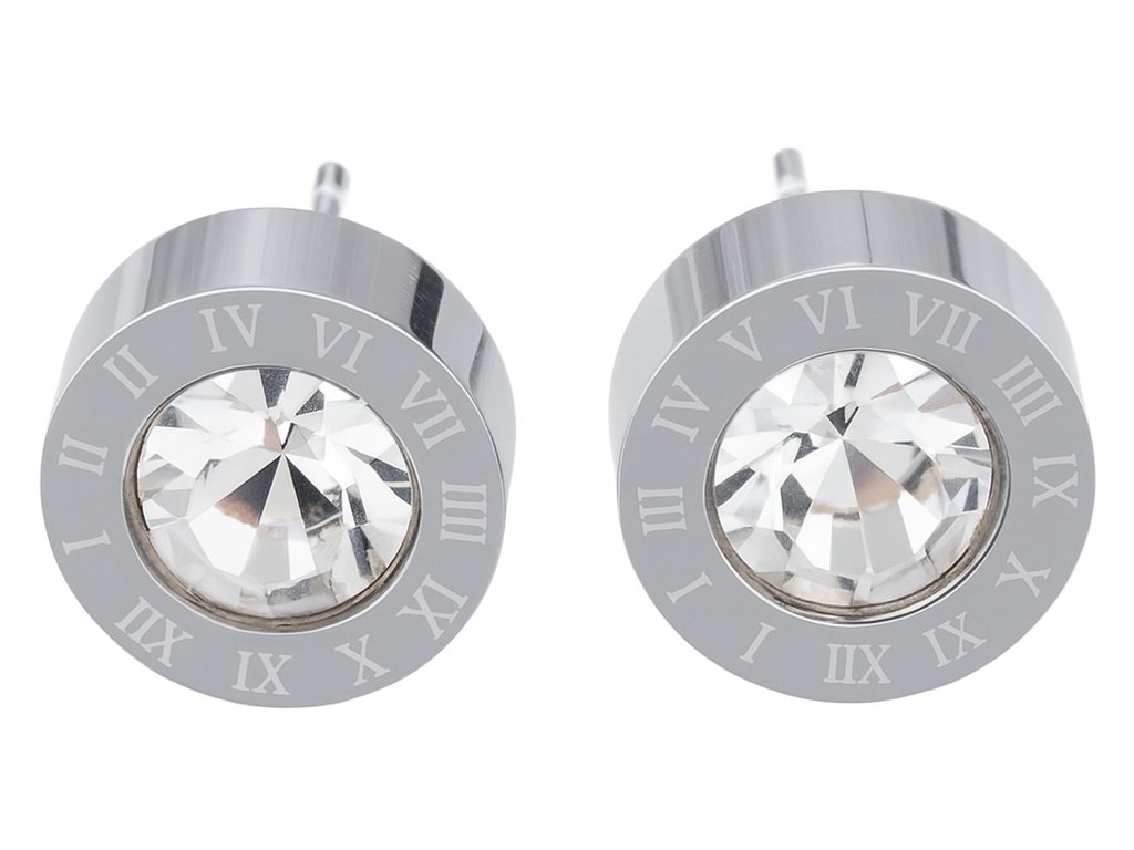 Elegantné náušnice z chirurgickej ocele s čírym kryštálom a dekorom rímskych číslic pre nadčasový vzhľad.