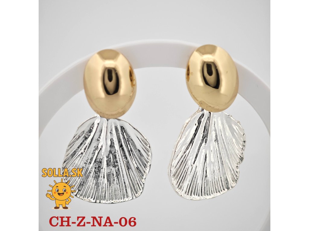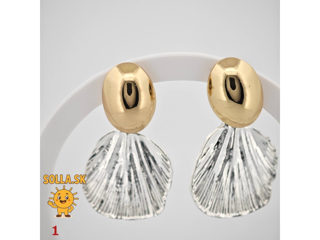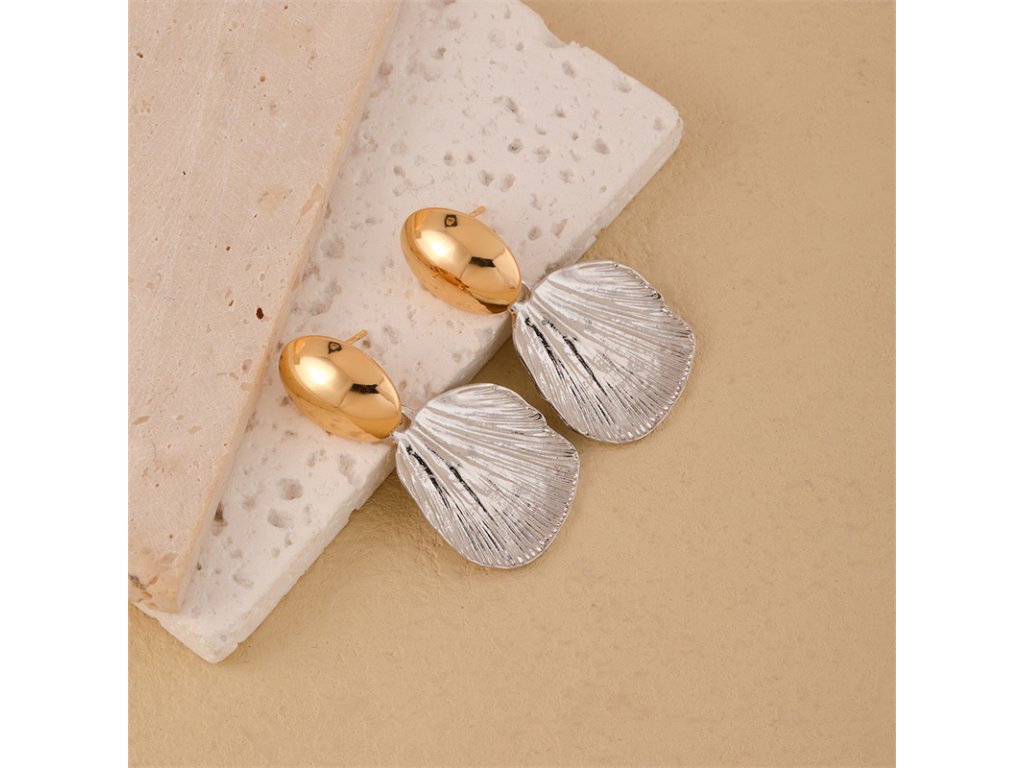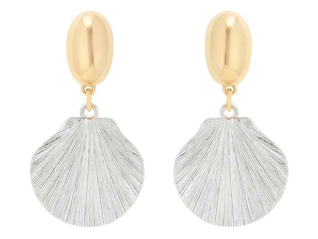 Bikolórne náušnice s motívom mušle – zlatený vrch, strieborný prívesok. Elegantné, ľahké a hypoalergénne.
