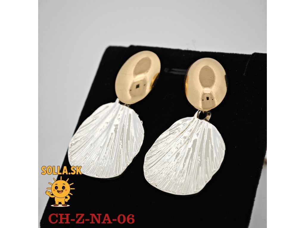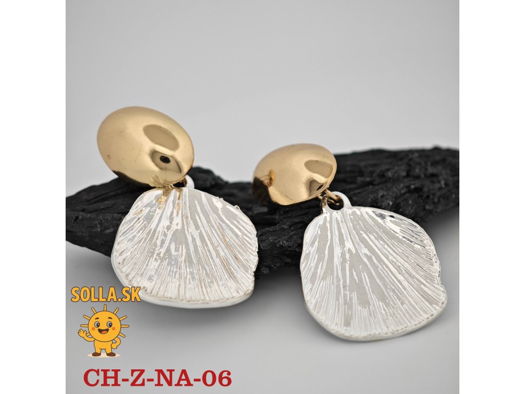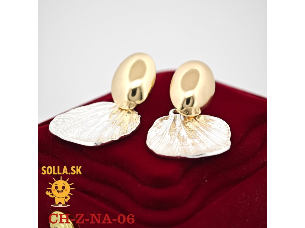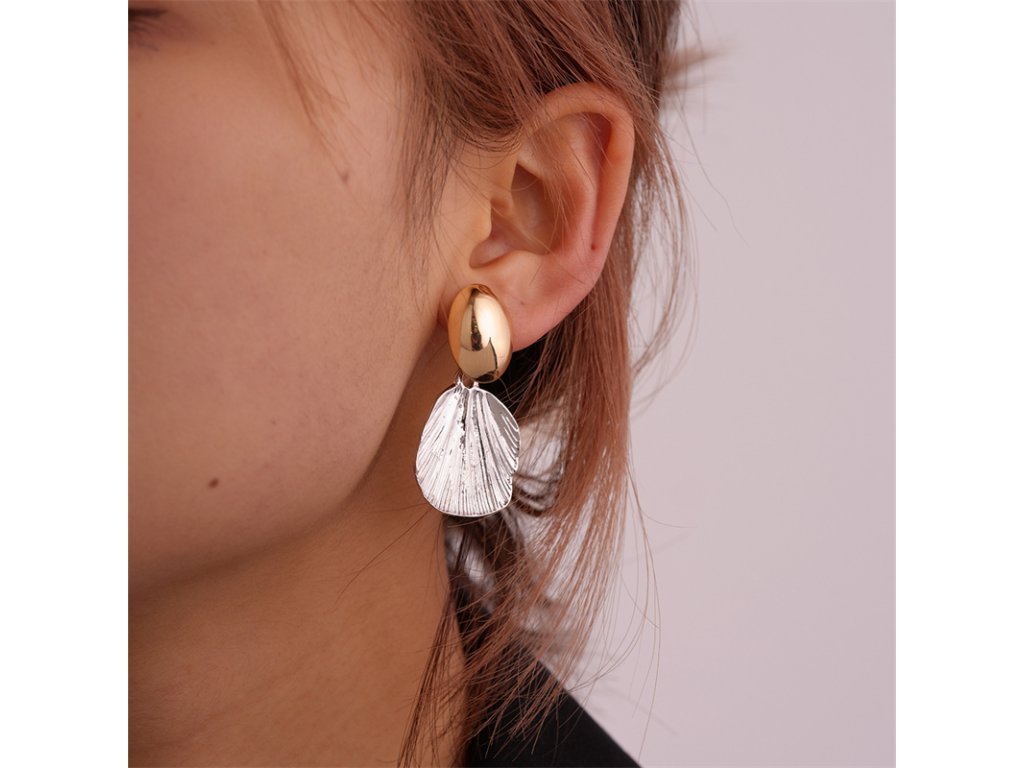 Bikolórne náušnice s motívom mušle – zlatený vrch, strieborný prívesok. Elegantné, ľahké a hypoalergénne.
