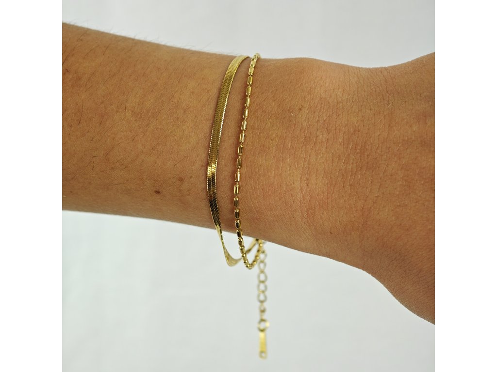 Dámsky dvojitý pozlátený náramok z chirurgickej ocele – Golden Duo spája dve štýlové retiazky v jednom šperku.