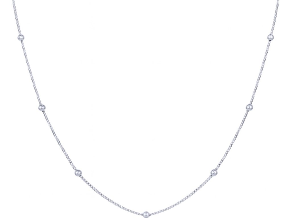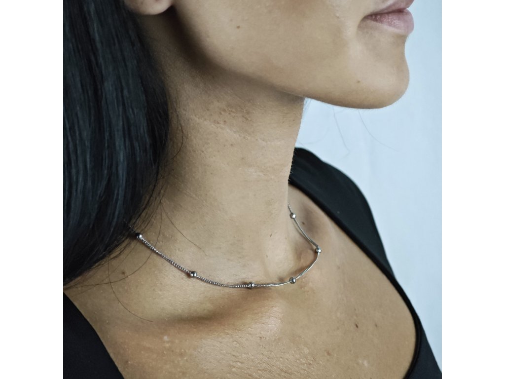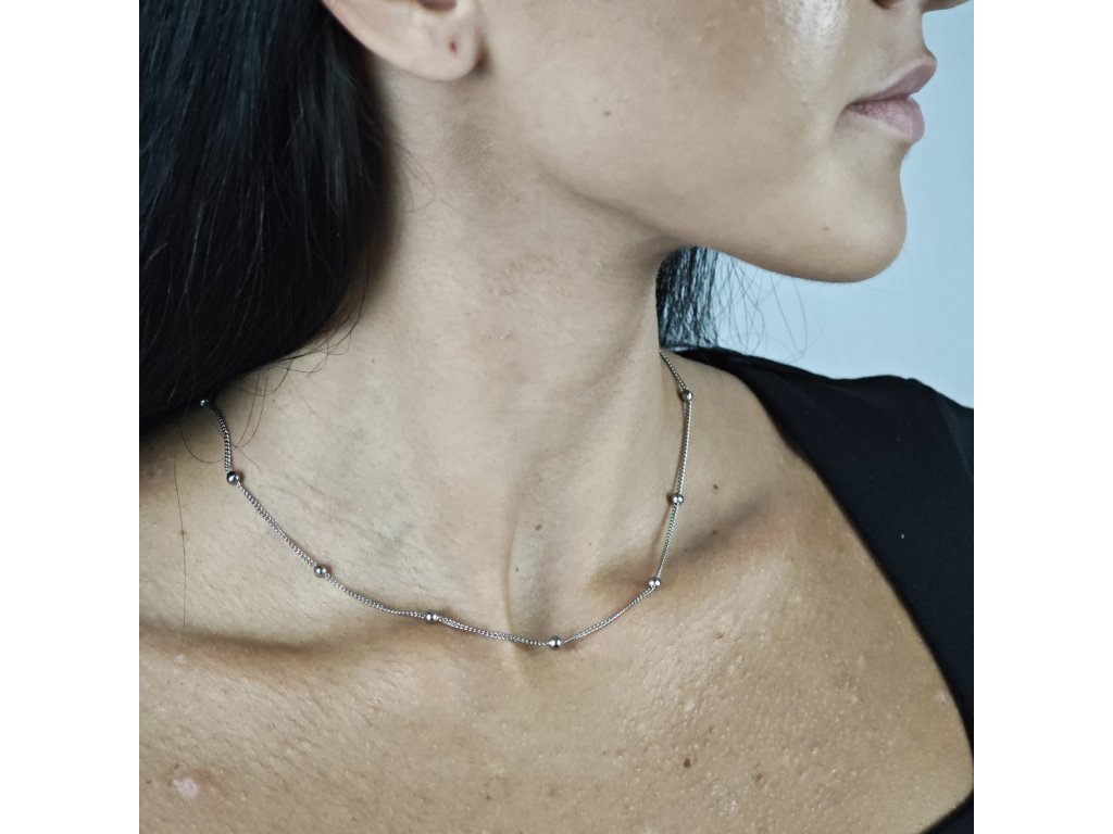 Delikátna retiazka je zdobená drobnými guľôčkami rovnomerne rozmiestnenými po celej dĺžke, čo dodáva náhrdelníku ľahký a elegantný vzhľad.