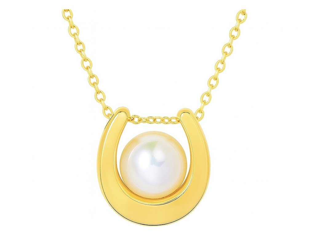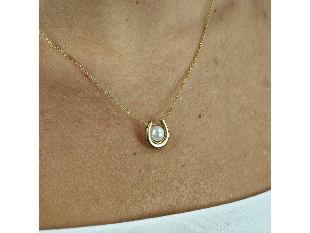 Elegantný náhrdelník z chirurgickej ocele v zlatej farbe s príveskom podkovy a bielou perlou pre šťastie a štýl.