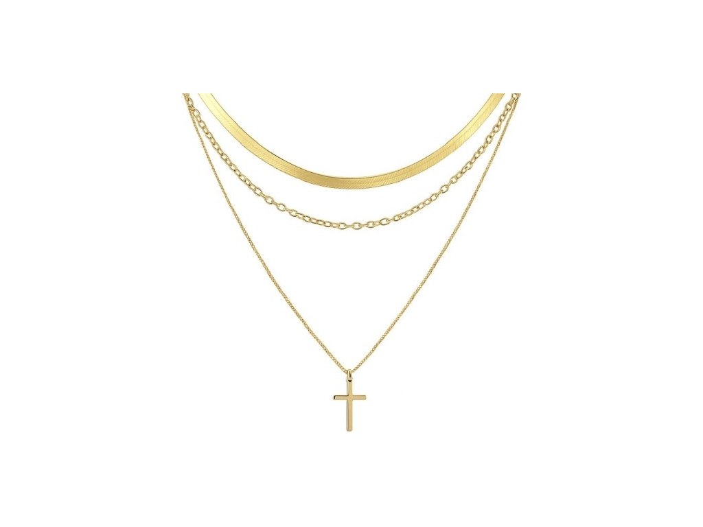 Náhrdelník spája hladký Flat Snake Chain, jemný Cable Chain a tretiu retiazku s jednoduchým krížikovým príveskom. Rozdielne štruktúry vytvárajú vyvážený vizuálny kontrast bez potreby ďalšieho vrstvenia. Všetky tri vrstvy sú navrhnuté tak, aby sa pri nosení nekrútili a držali svoj tvar.
