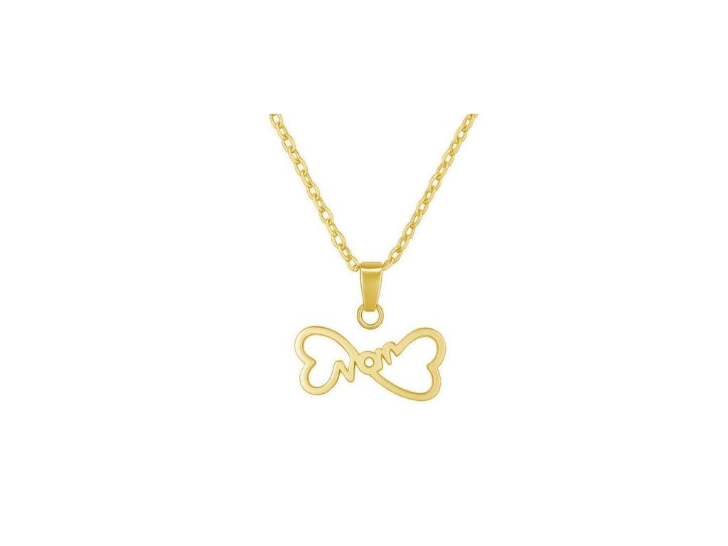 Elegantný náhrdelník z hypoalergénnej chirurgickej ocele so symbolom nekonečna, dvoma srdciami a nápisom „Mom“, dostupný v striebornej aj zlatej variante.