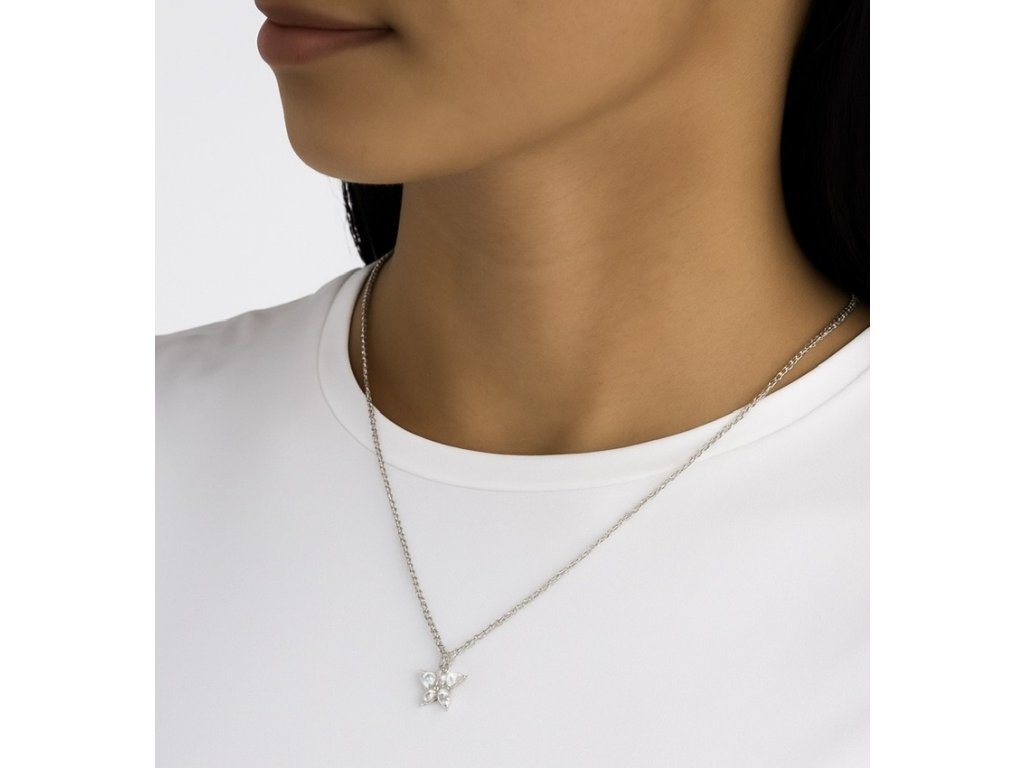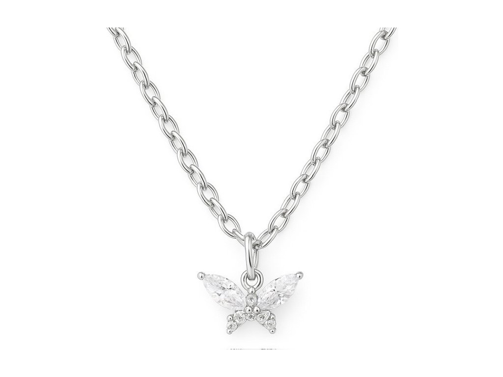 Whispering Wings je náhrdelník z rýdzeho striebra 925, zdobený žiarivými bielymi zirkónmi, ktoré evokujú nežný motív motýlích krídel.