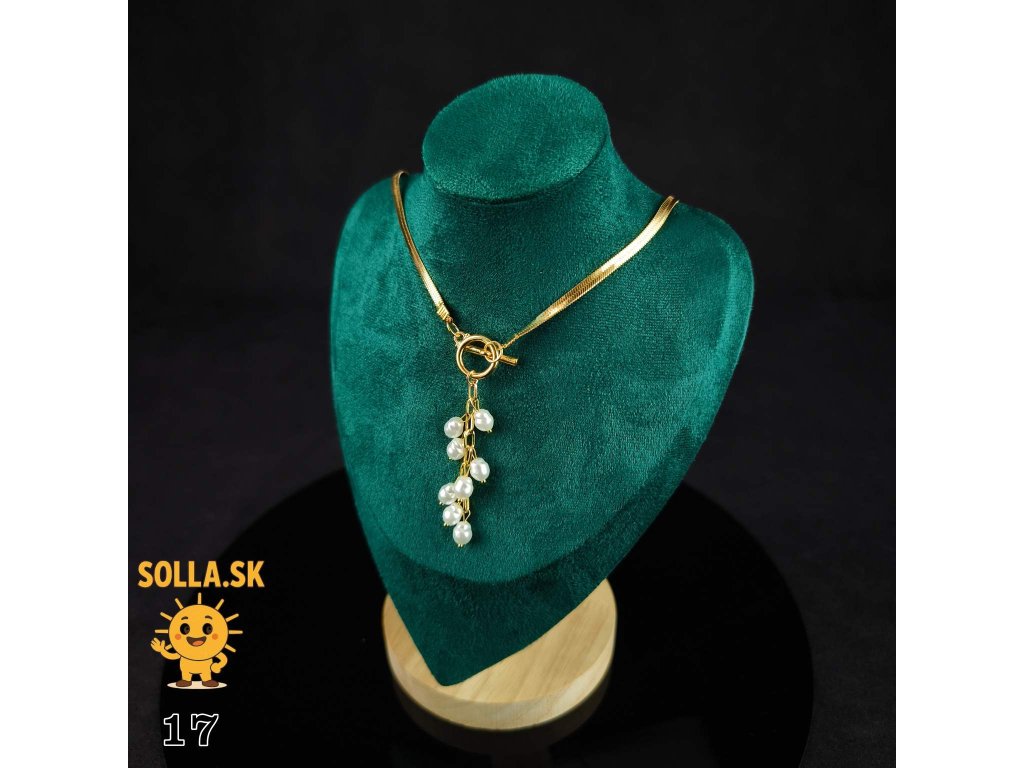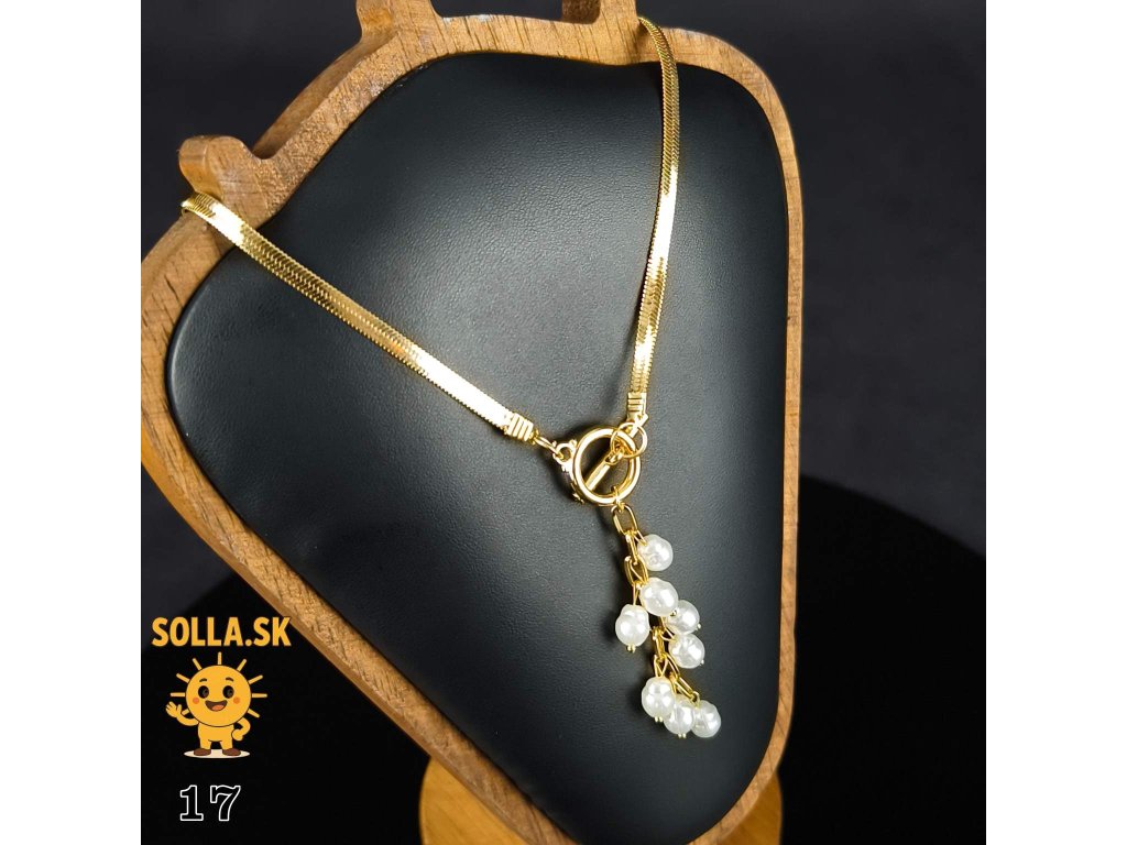Hladká zlatá retiazka je doplnená o visiaci prívesok s drobnými bielymi perlami, ktoré sa jemne pohupujú a zachytávajú svetlo pri každom pohybe.