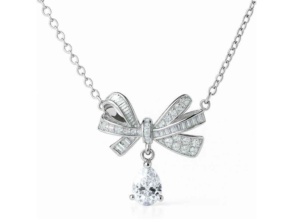 Romantický náhrdelník z chirurgickej ocele s mašľou zdobenou zirkónmi a kvapkovým príveskom.