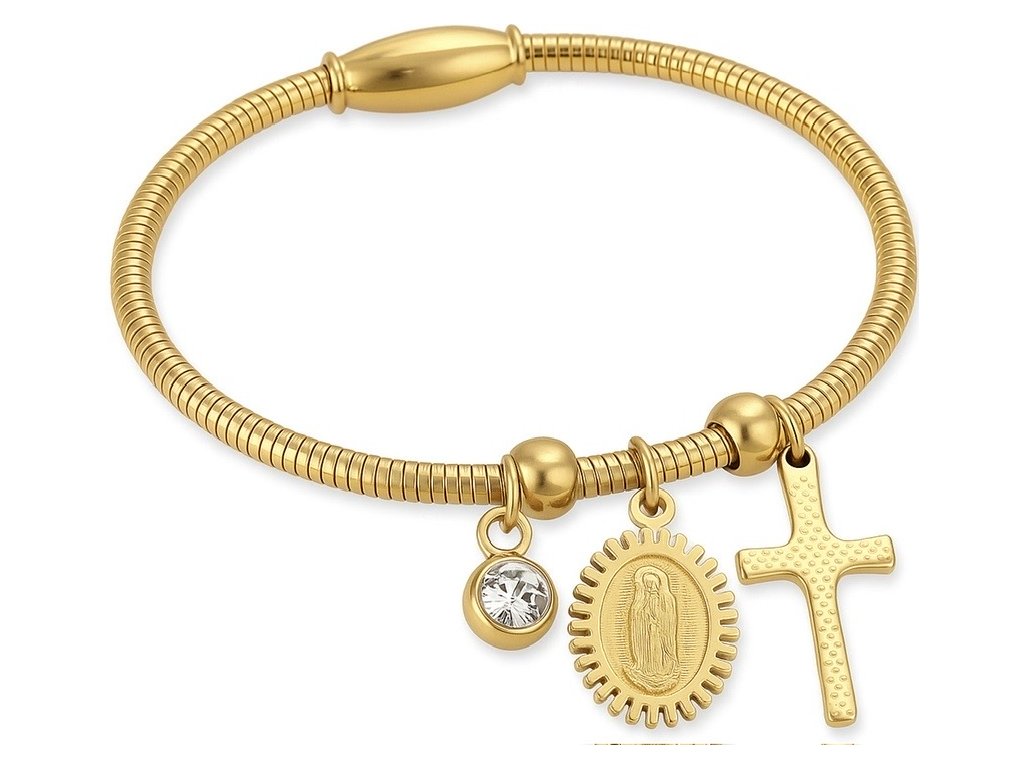 Na náramku sú zavesené tri významné prívesky – kríž ako symbol viery a nádeje, medailón Panny Márie ako ochrana a duchovná podpora a priehľadný kryštál, ktorý predstavuje svetlo, čistotu a jas mysle.