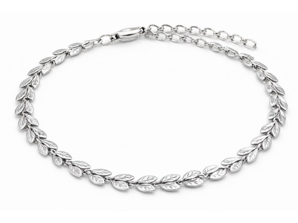 Elegantný náramok z chirurgickej ocele s jemným motívom lístkov – symbol prírody a harmónie.