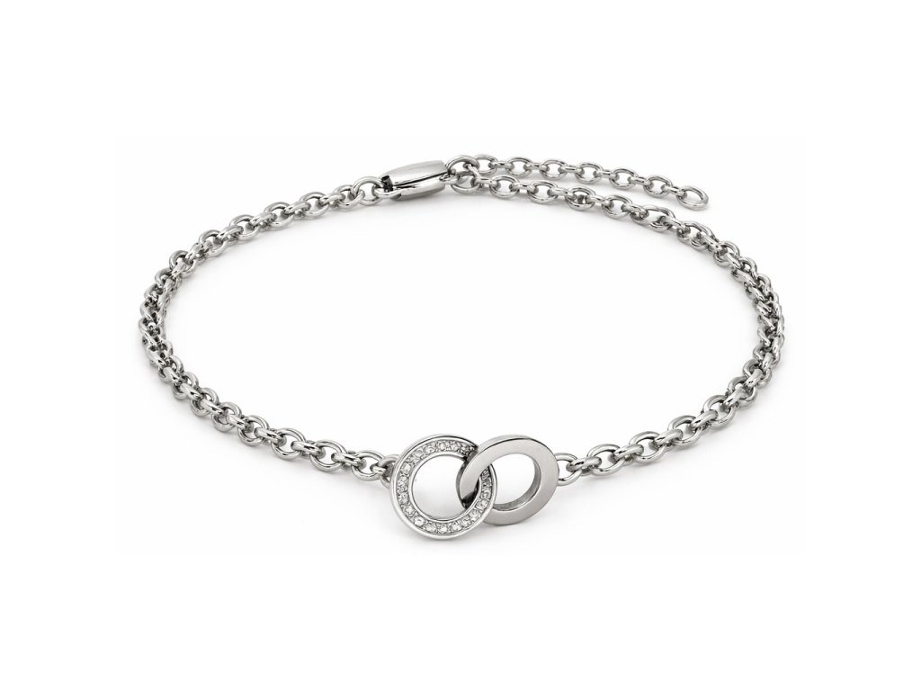 Dominantou náramku sú dva prepojené kruhy – jeden s hladkým povrchom, druhý zdobený jemnými kryštálmi. Kontrast medzi hladkým kovom a trblietavým detailom vytvára vyvážený a decentný vzhľad, ktorý sa ľahko kombinuje s ďalšími šperkami.