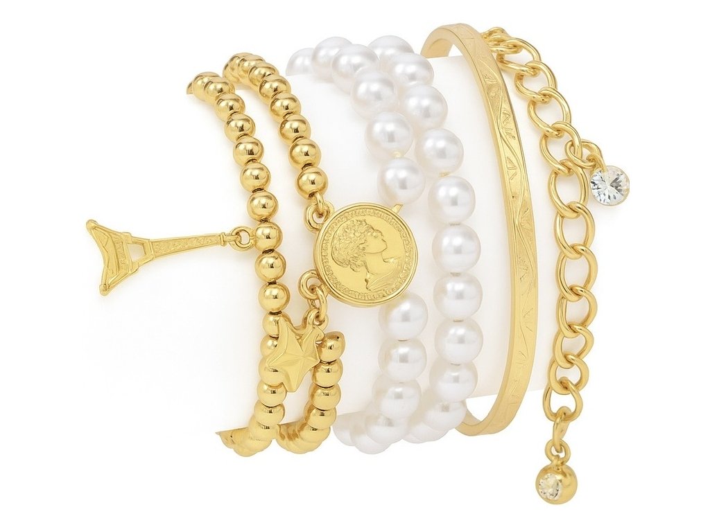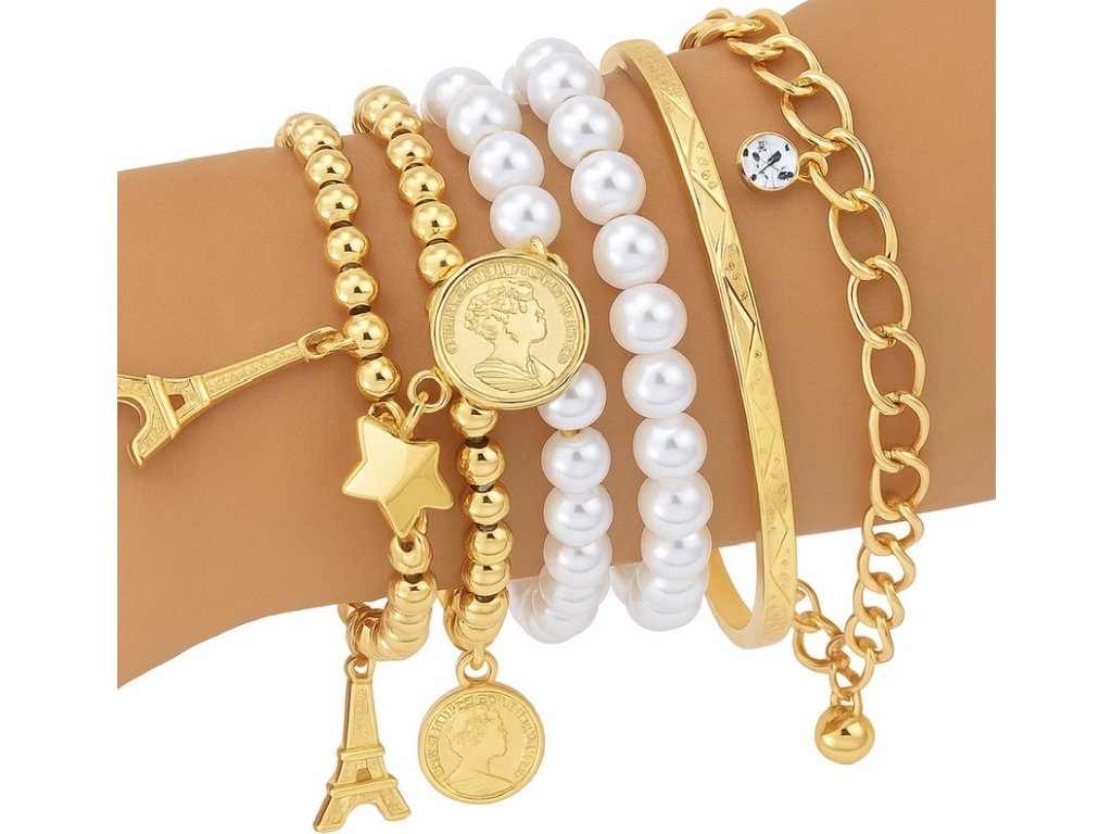 Paris Lumière je súprava zlatých náramkov z chirurgickej ocele doplnená perlami a príveskami. Spája eleganciu Paríža, ženský pôvab a jemný lesk, ktorý rozžiari každý outfit.