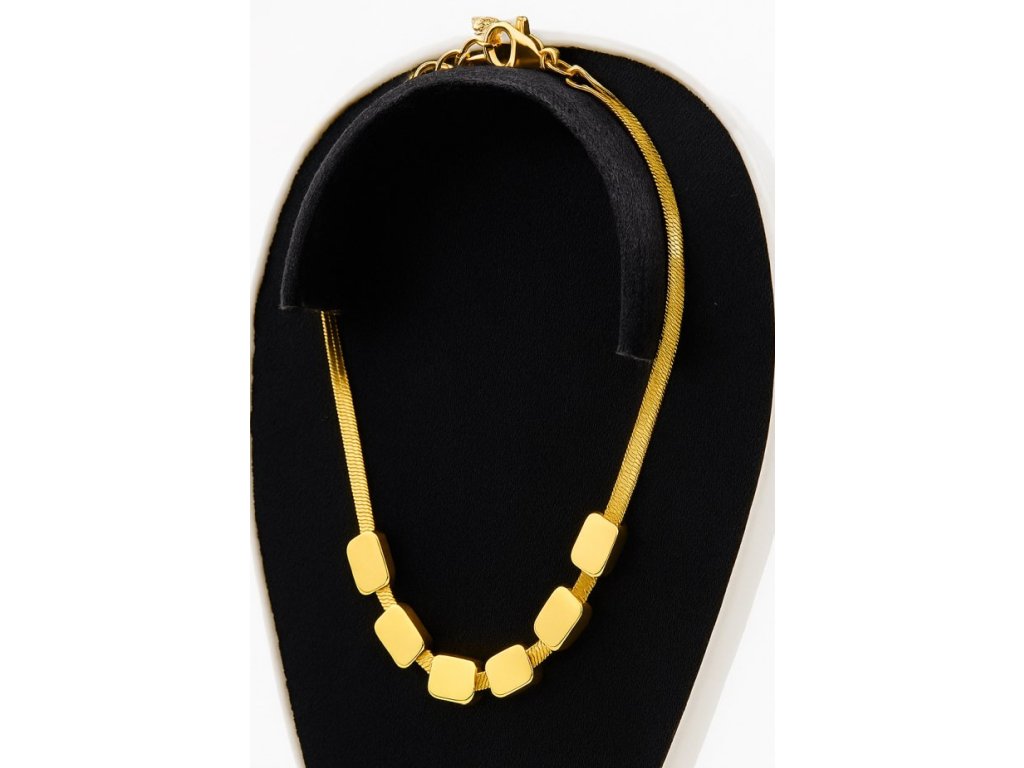 Náramok je zdobený malými zlatými kockami, ktoré vytvárajú jemný rytmus a hru svetla pri každom pohybe. Tento geometrický motív pôsobí moderne, no zároveň decentne, takže šperk krásne dopĺňa formálne aj ležérne outfity. Vďaka zlatému povrchu s vysokým leskom pôsobí náramok luxusne, no zostáva vkusne minimalistický.