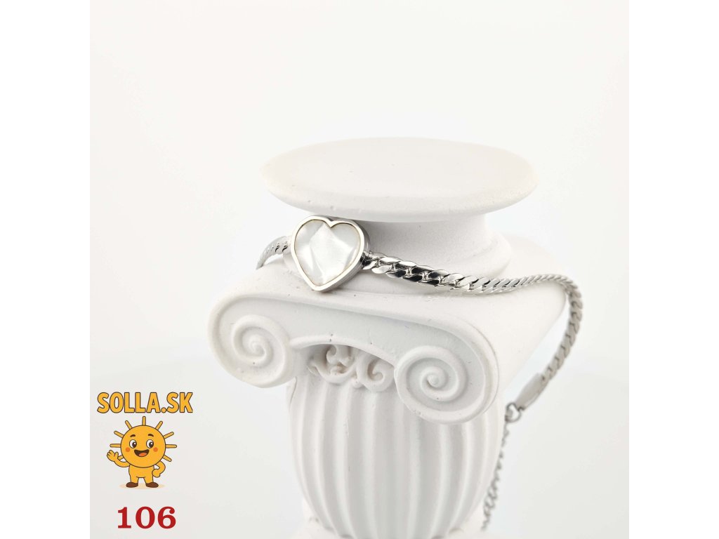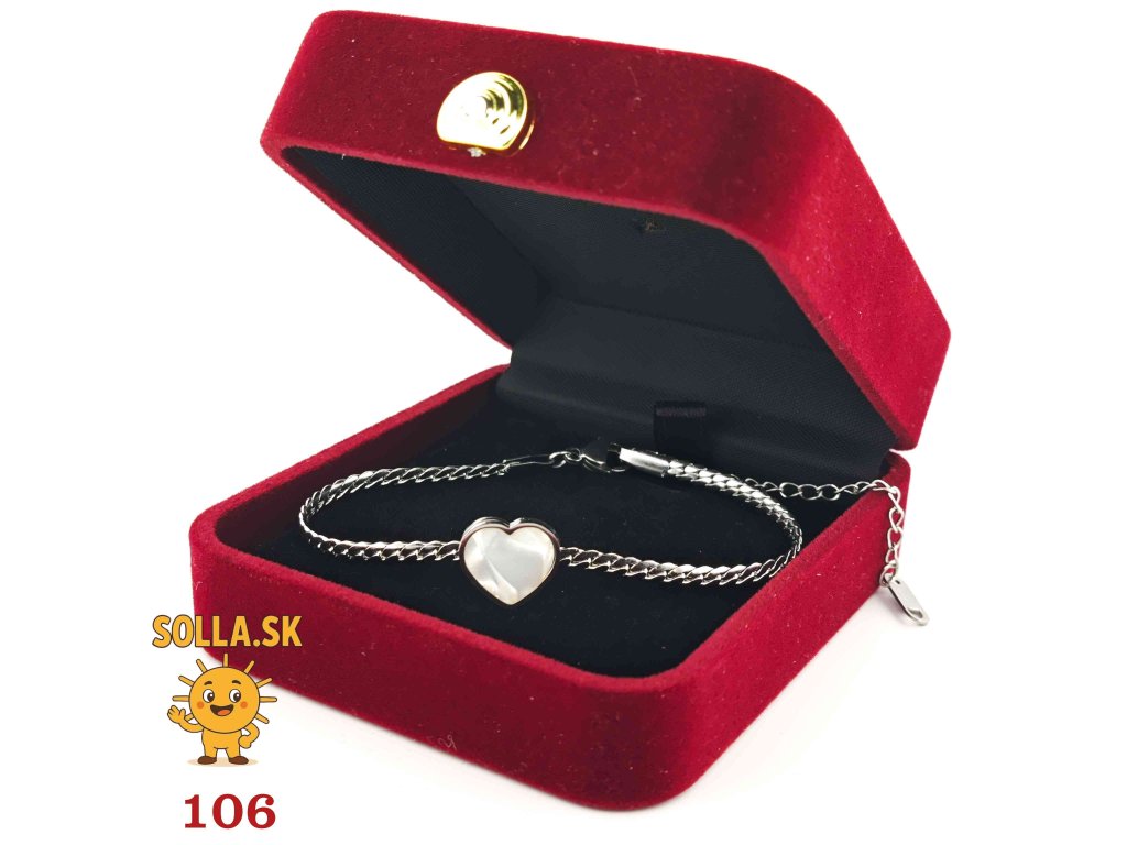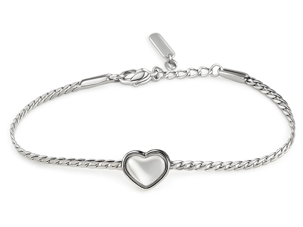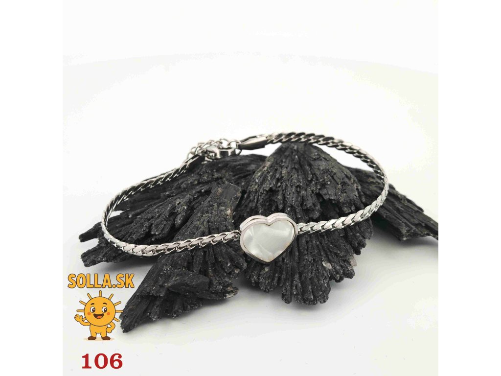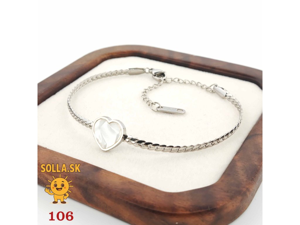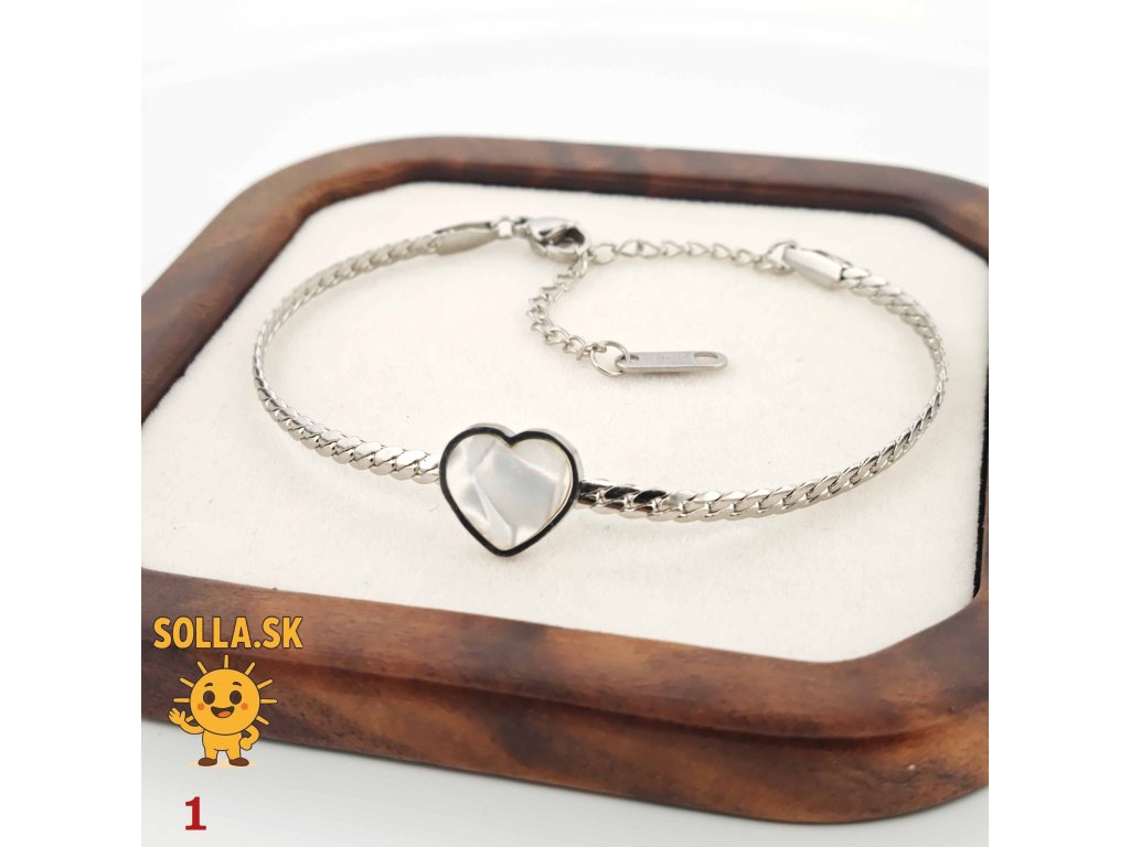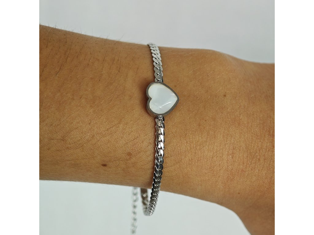Jemný náramok z chirurgickej ocele so srdiečkom a perleťovým leskom – nežný a romantický doplnok.