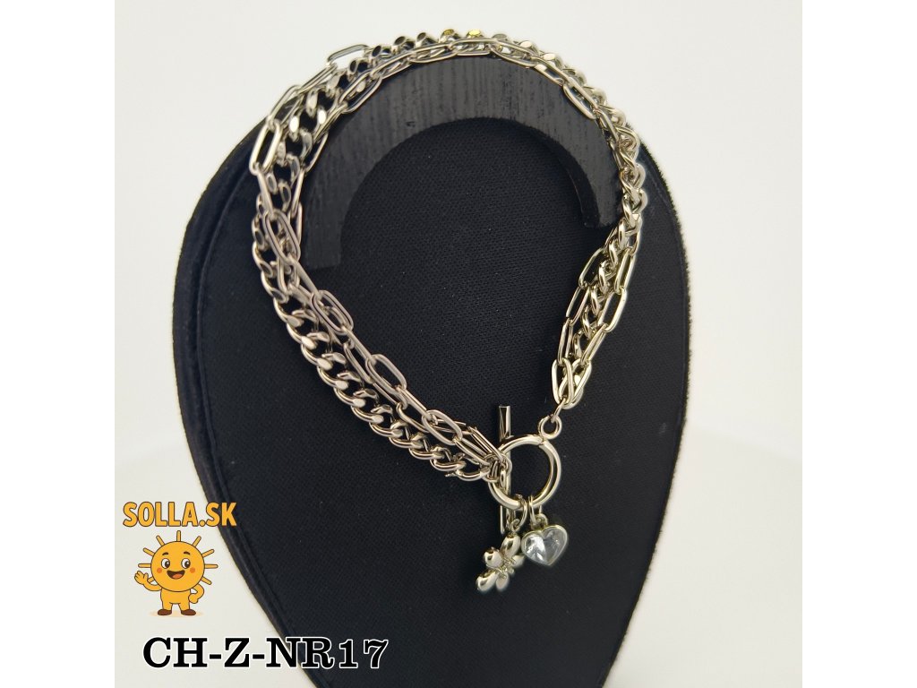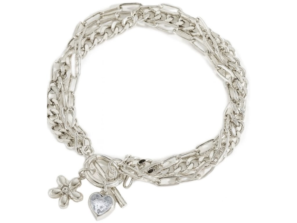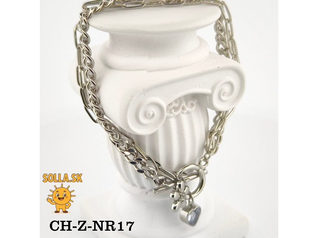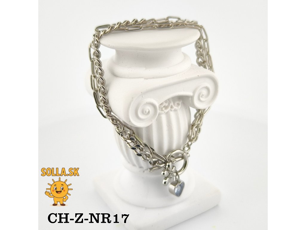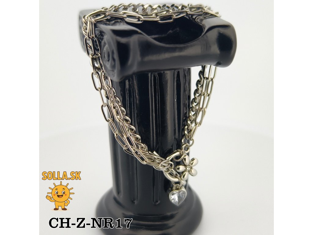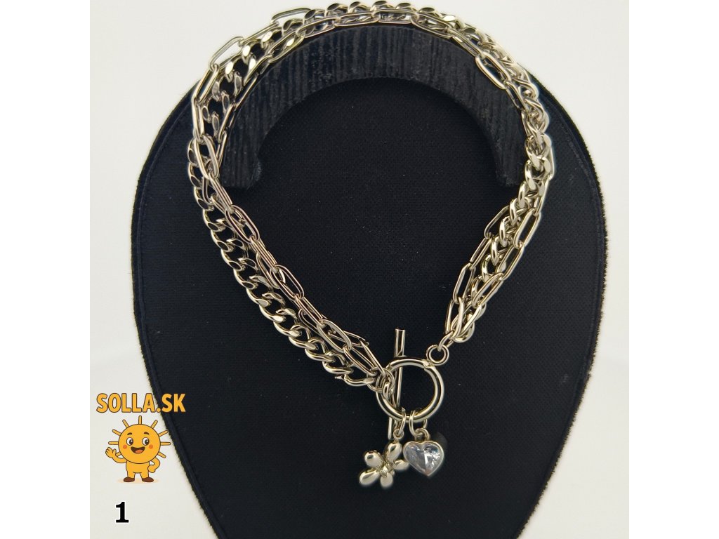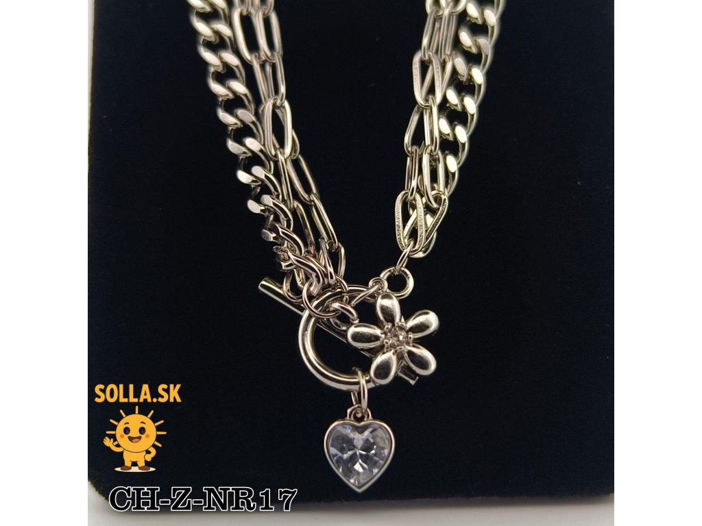 Kombinácia viacerých typov retiazok dodáva šperku moderný vrstvený efekt, zatiaľ čo prívesok v tvare srdca so zirkónom a kvetinový prívesok prinášajú romantický nádych.
