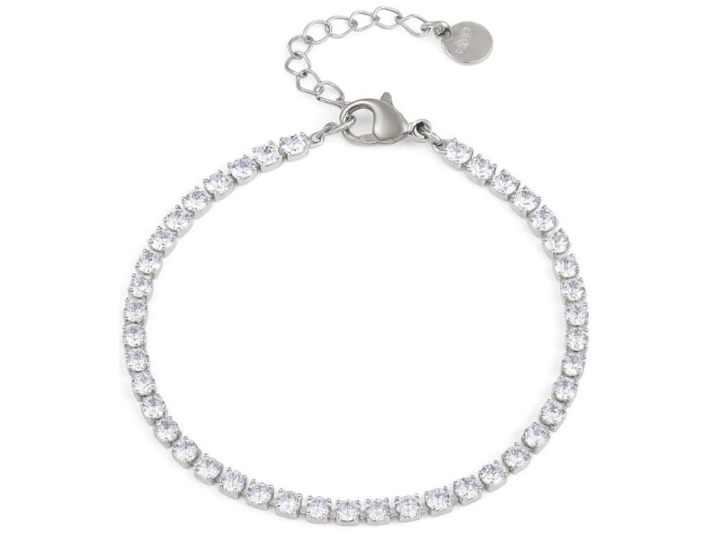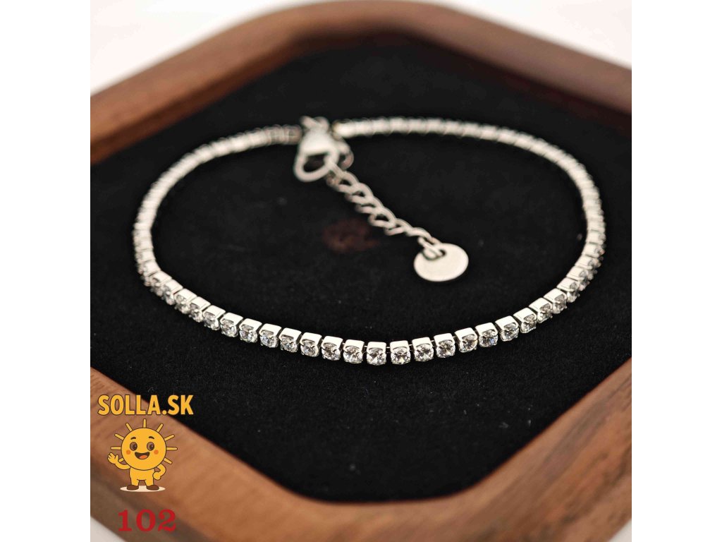 Tenká a precízna línia kamienkov dodáva náramku luxusný a sofistikovaný vzhľad, vďaka čomu je ideálny na spoločenské udalosti, no zároveň dostatočne decentný na každodenné nosenie. Predlžovacia retiazka s gravírovaným príveskom zabezpečí, že sa prispôsobí rôznym veľkostiam zápästia.