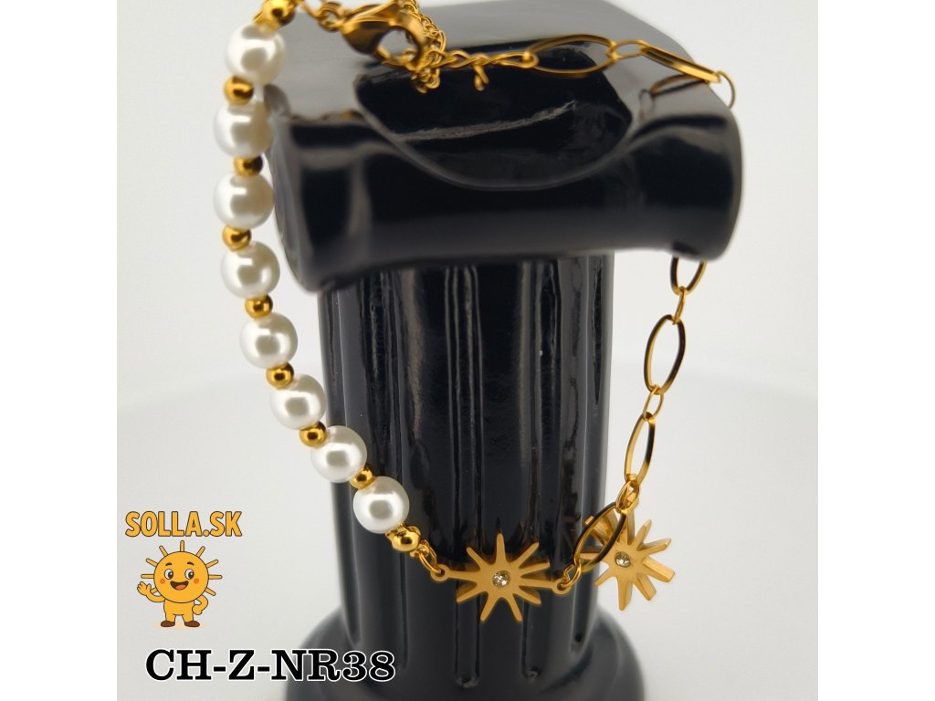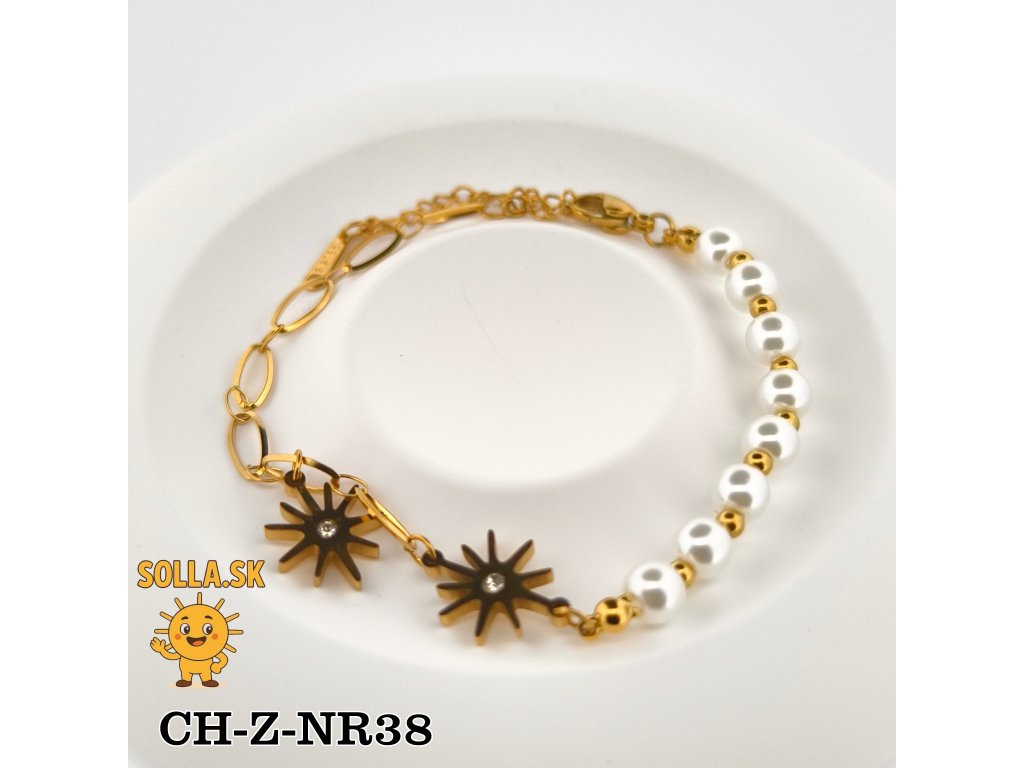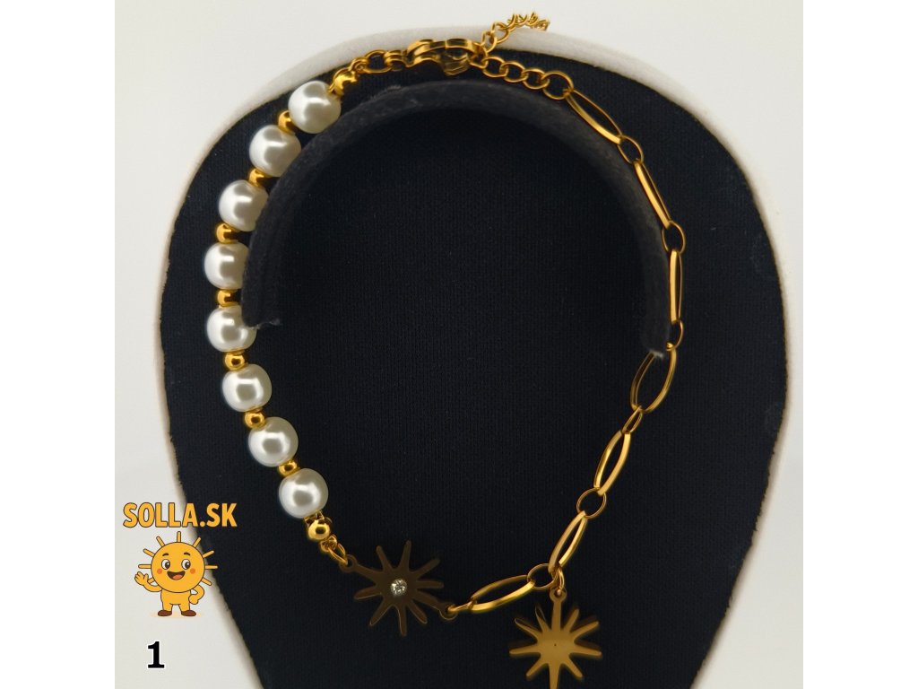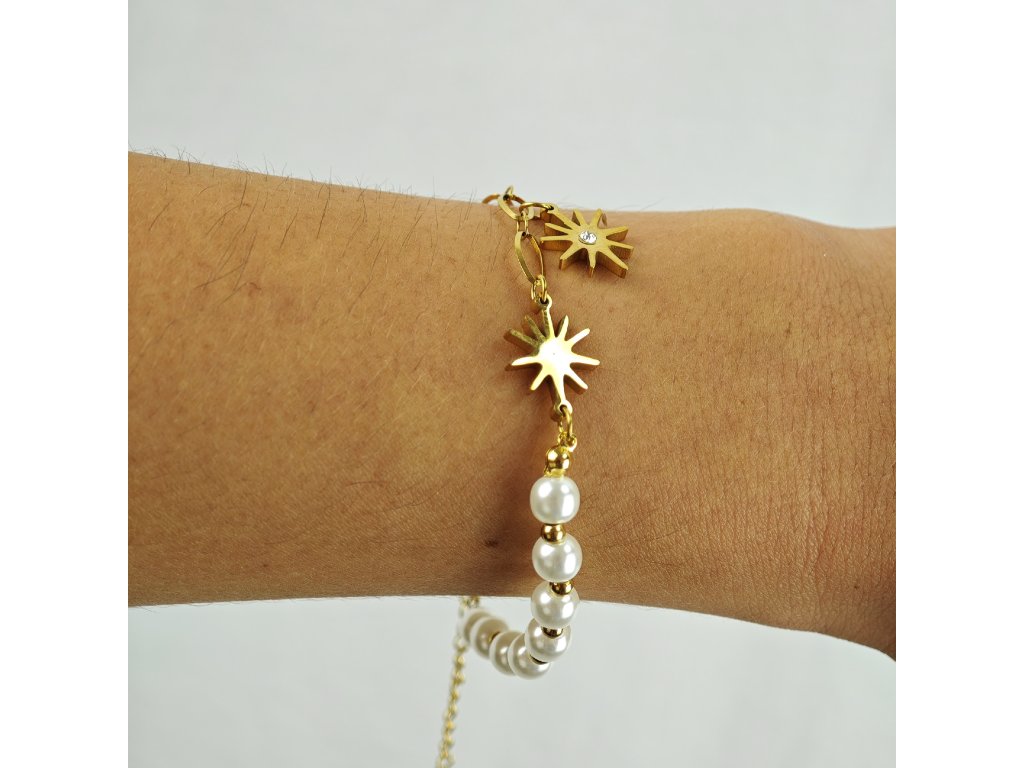 Elegantný náramok zo zlatej chirurgickej ocele zdobený perlami a hviezdami s kryštálmi – žiarivý doplnok pre každý deň.
