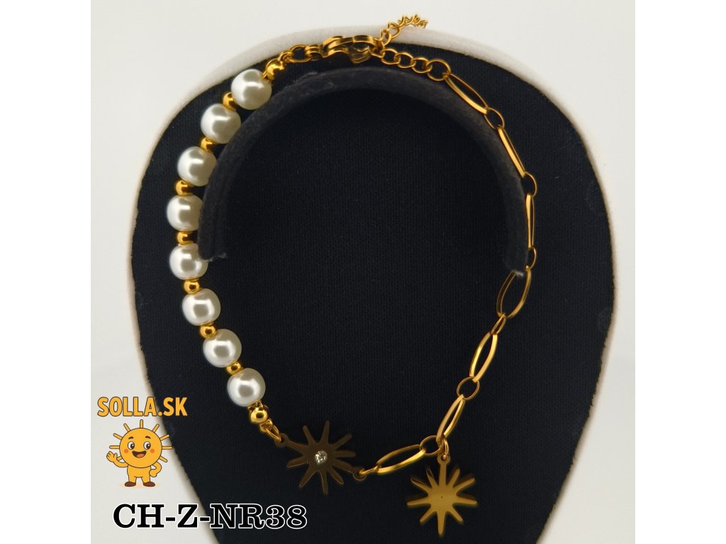Jeho unikátny dizajn kombinuje klasický perlový rad s modernými článkovými očkami, ktoré dopĺňajú dva prívesky v tvare slnka či hviezdy. Tento kontrast dodáva šperku výnimočnosť a eleganciu.