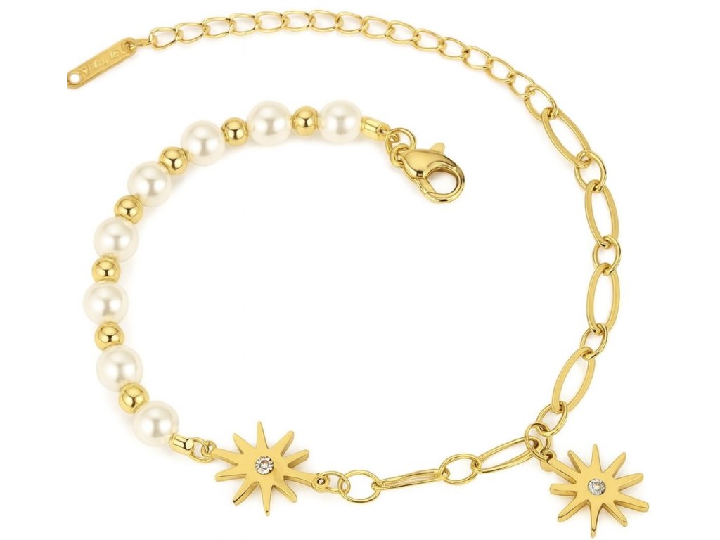 Náramok Stella spája krásu zlatej chirurgickej ocele, nežnosť perličiek a žiarivý pôvab hviezd zdobených drobnými kryštálmi.