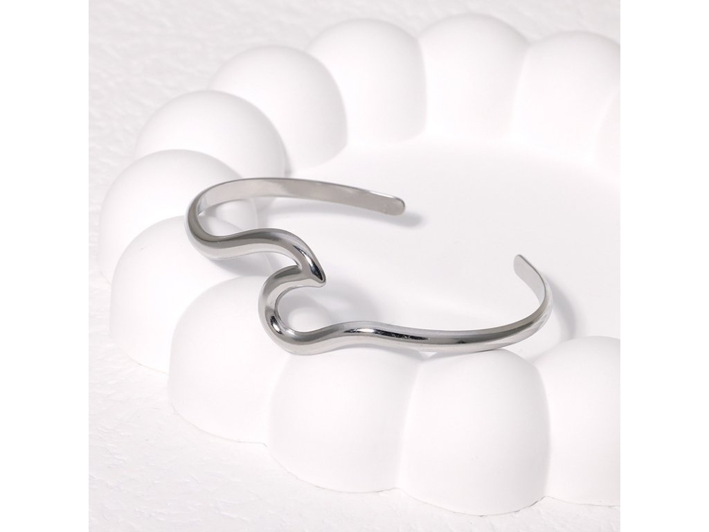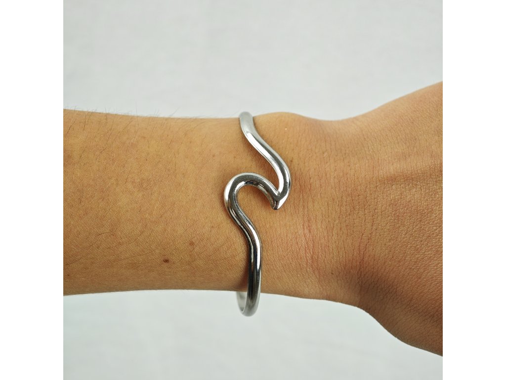 Minimalistický dámsky náramok z chirurgickej ocele v tvare elegantnej vlny – symbol voľnosti a plynulosti.
