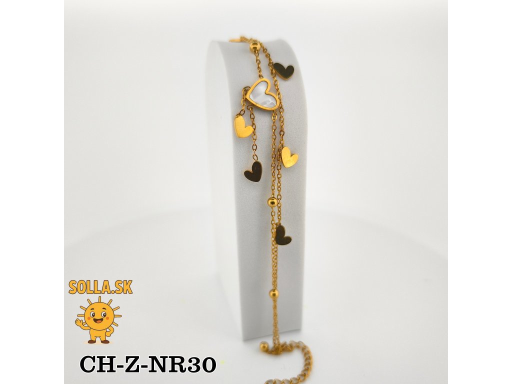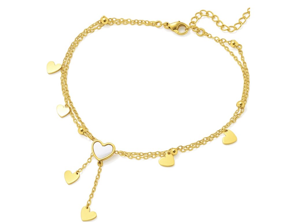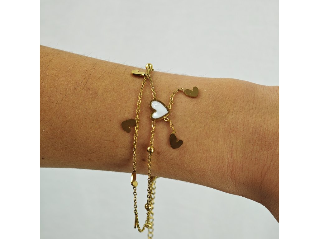 Romantický pozlátený náramok z chirurgickej ocele s príveskami v tvare srdiečok a perleťovým detailom uprostred.