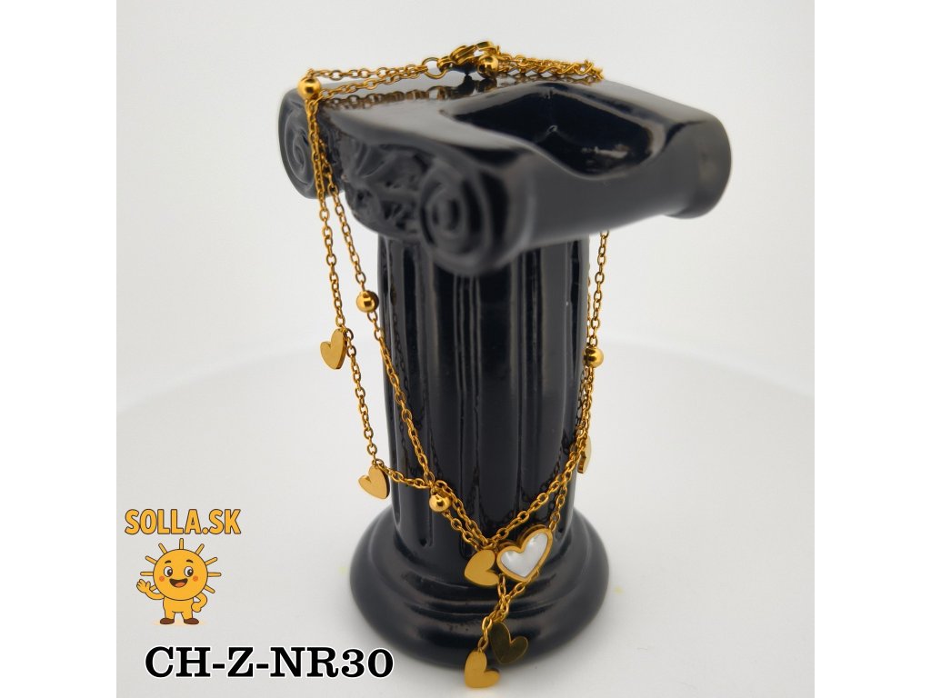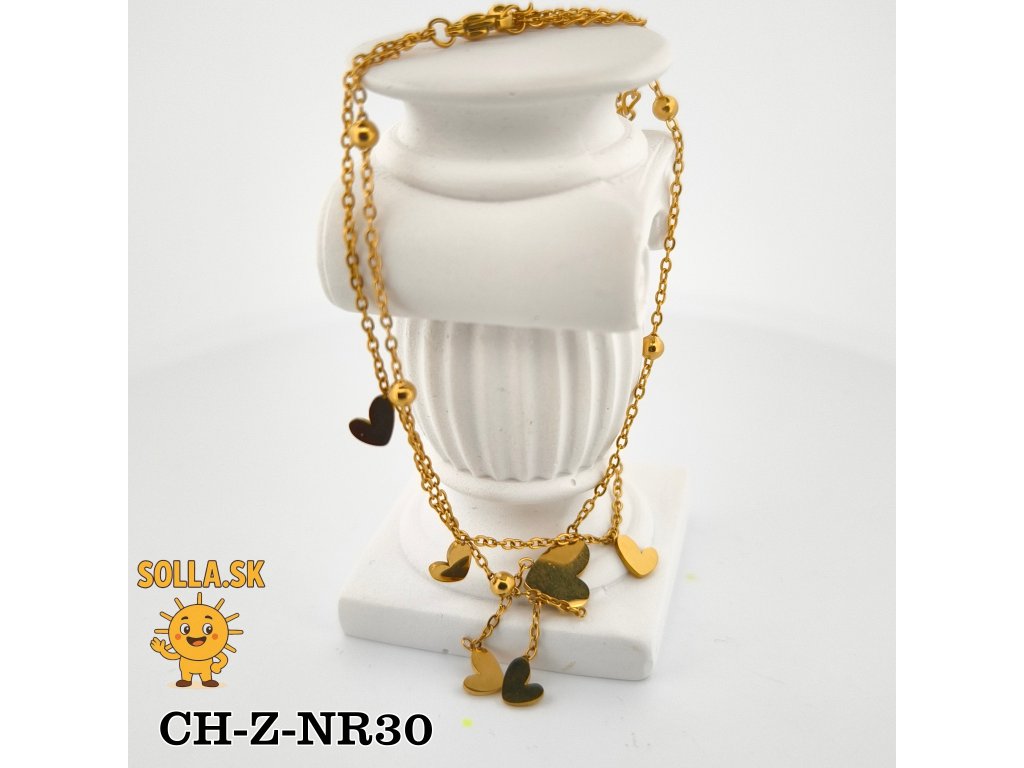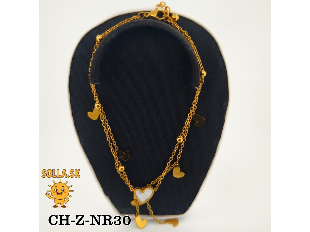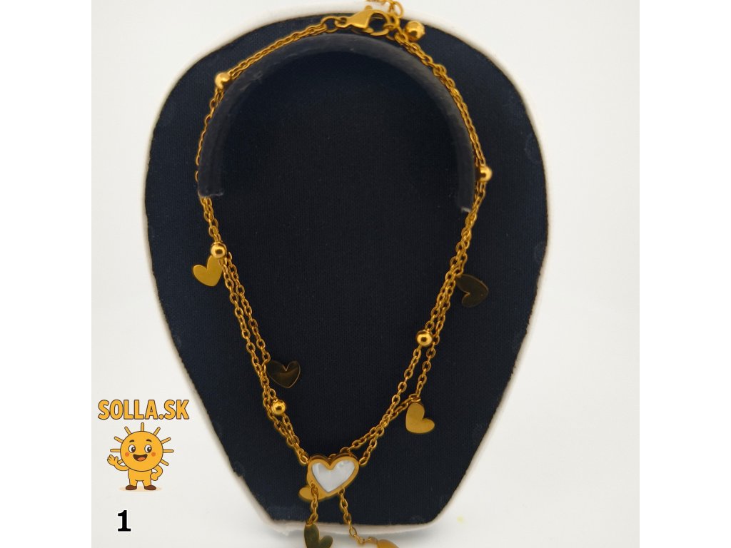 Hlavnou ozdobou je perleťové srdiečko doplnené drobnými zlatými príveskami, ktoré sa jemne pohupujú pri každom pohybe.