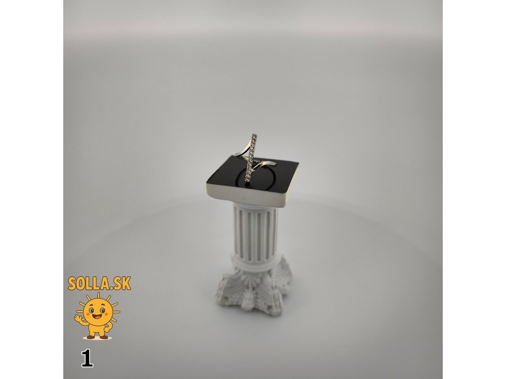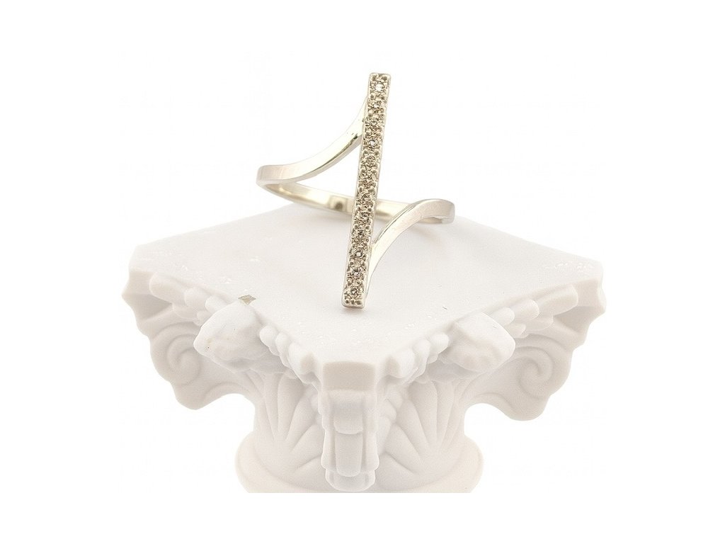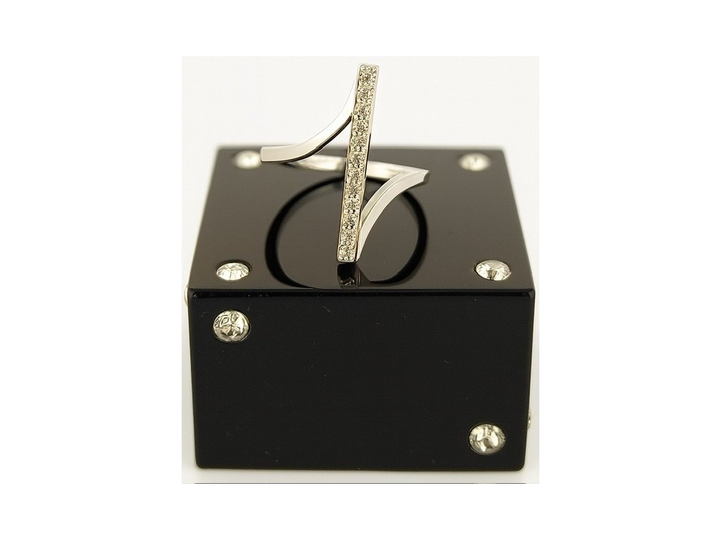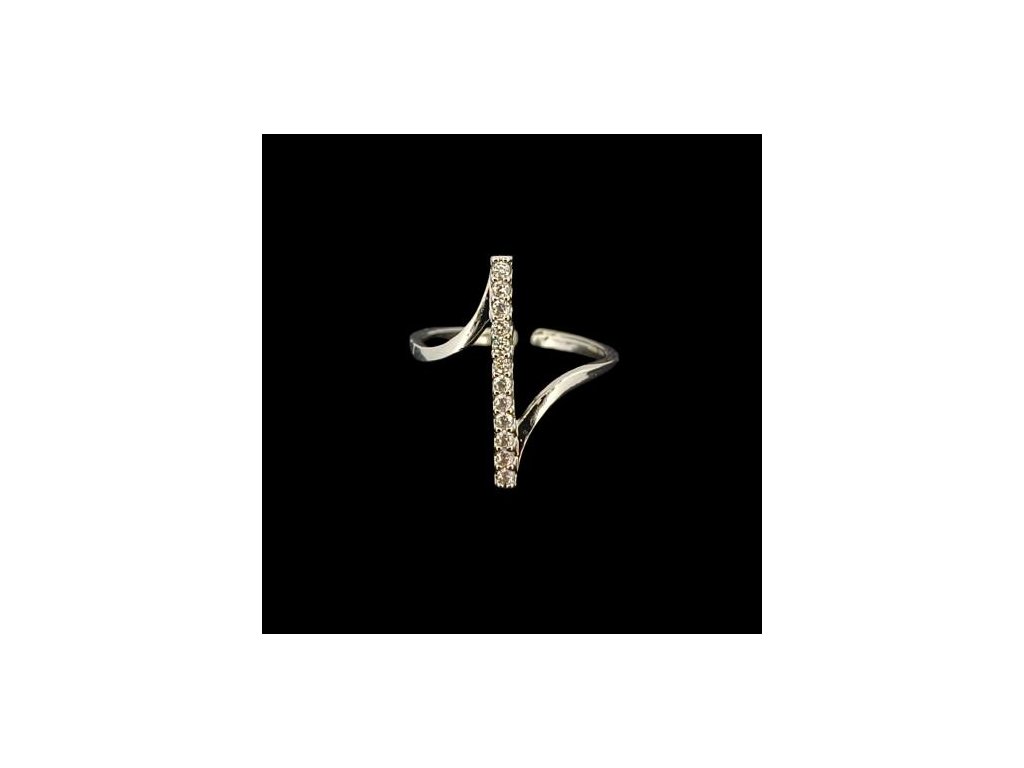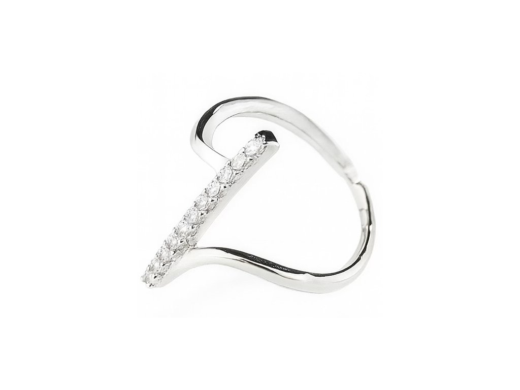 Jeho asymetrický, jemne zvlnený tvar prirodzene kopíruje líniu prsta a pôsobí žensky a elegantne. Po celej dĺžke ho zdobí rad precízne osadených zirkónov, ktoré vytvárajú trblietavý akcent – ako lúče svetla kĺzajúce po hladine. Dizajn pôsobí moderným, no nadčasovým dojmom, ideálnym pre ženy, ktoré oceňujú decentný luxus.
