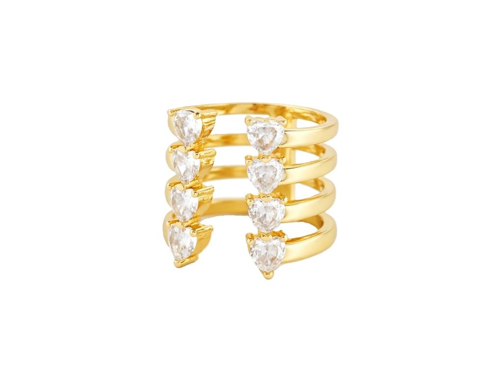 Golden Cascade je dámsky prsteň s otvoreným dizajnom, zdobený ôsmimi brúsenými zirkónmi v tvare srdca. Zlatý povrch v kombinácii s čírymi kamienkami vytvára výrazný, no stále elegantný vzhľad vhodný na každodenné aj slávnostné nosenie.