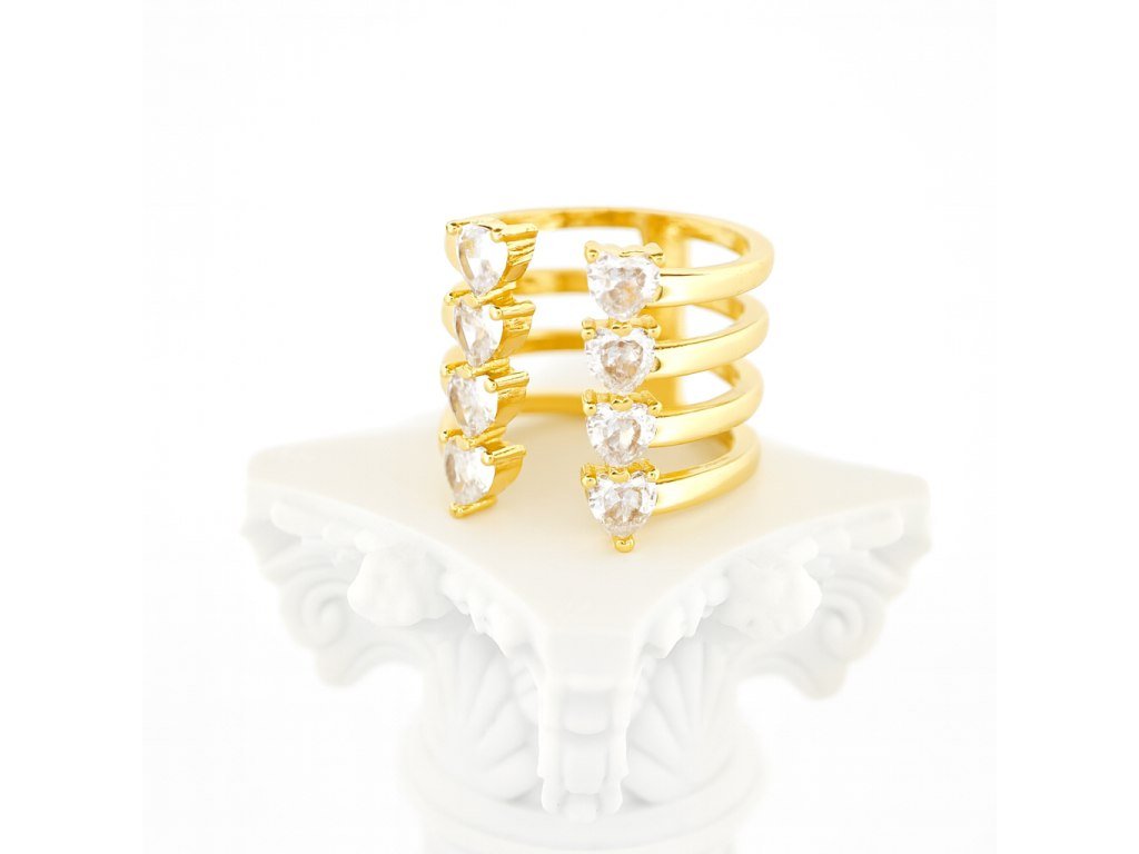 Dominantným prvkom prsteňa je osem drobných zirkónov v tvare srdca, ktoré sú osadené v rade a vytvárajú kaskádový efekt. Lesklý zlatý povrch kontrastuje s čírymi kamienkami a dodáva šperku moderný a ženský charakter.