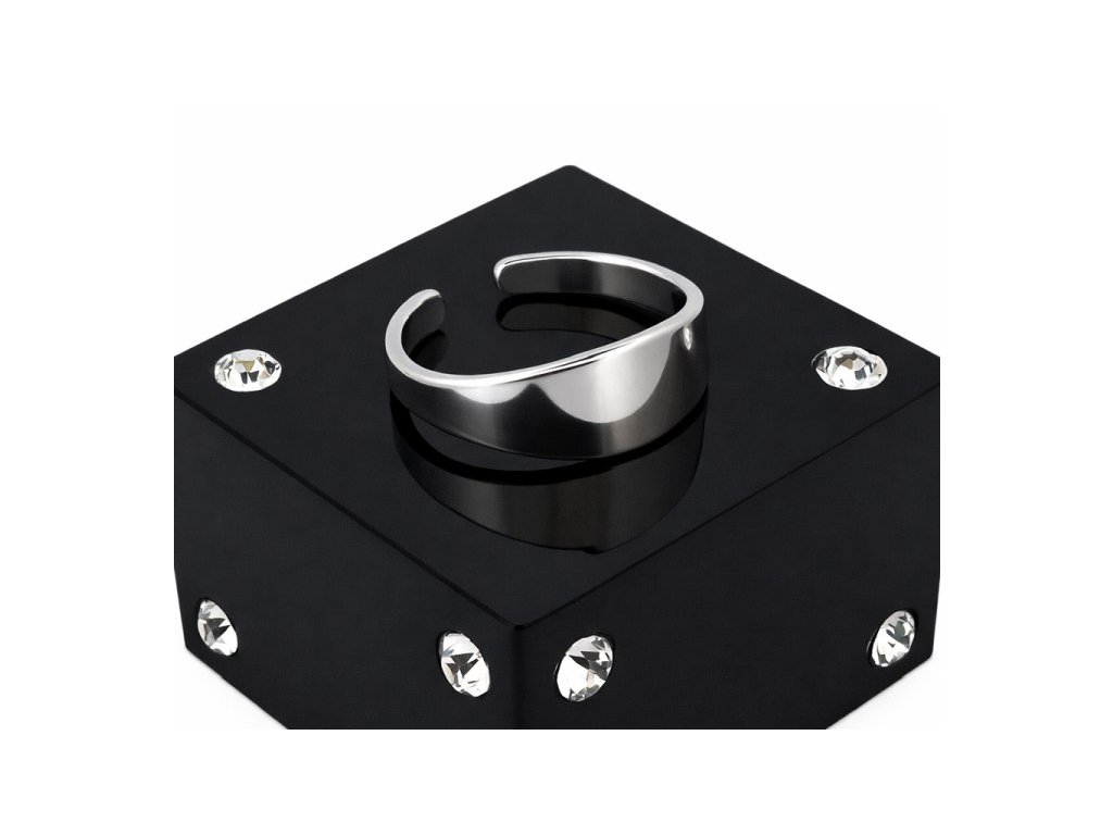 Prsteň má jemne otvorenú konštrukciu, ktorá umožňuje mierne prispôsobenie veľkosti. Minimalistický tvar pôsobí moderne a vzdušne, bez dekoratívnych prvkov. Vysoko leštený povrch zvýrazňuje čistotu dizajnu a dodáva prsteňu elegantný oceľový lesk.