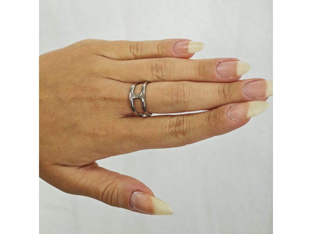 Vyrobený z hypoalergénnej chirurgickej ocele, prsteň odoláva poškriabaniu, nečernie a zachováva si svoj lesk aj pri každodennom nosení. Jeho geometrické línie vytvárajú zaujímavú hru svetla a tieňa – pôsobia moderne, no zároveň jemne a žensky. Každý výrez je precízne tvarovaný tak, aby podčiarkol rovnováhu medzi silou a jednoduchosťou.