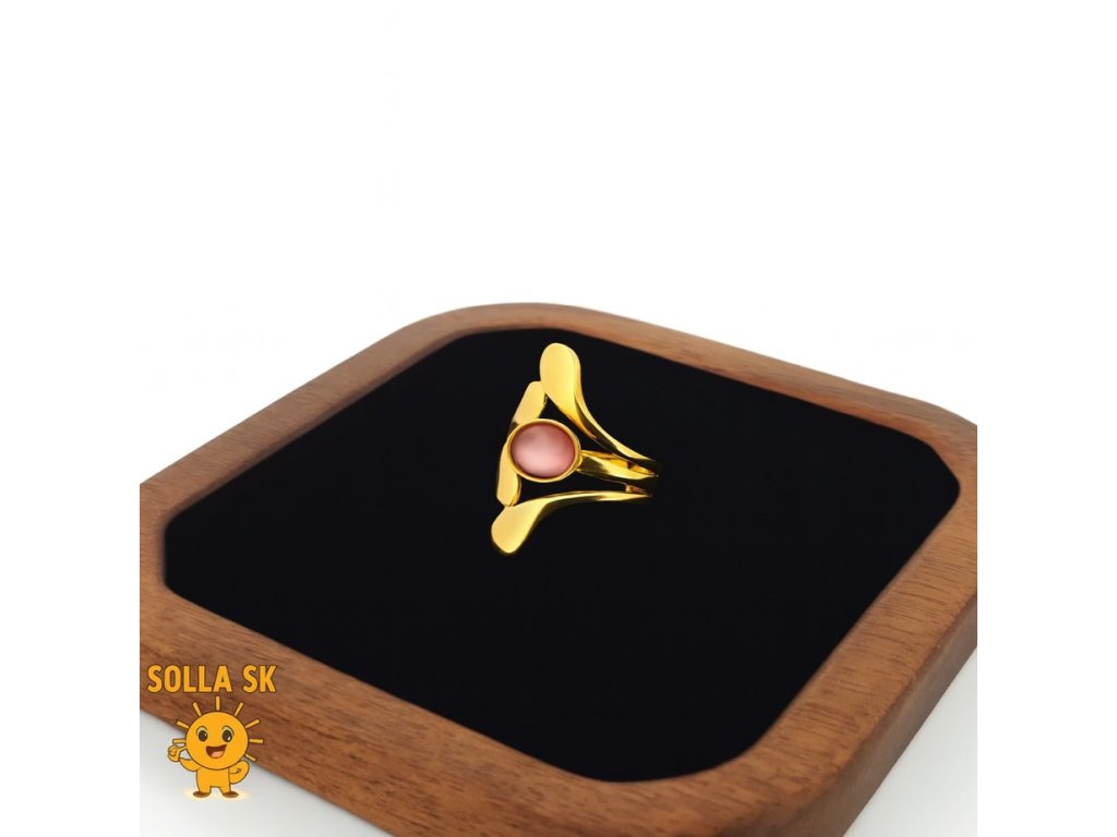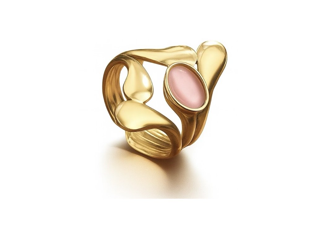 Dominantou prsteňa je oválny ružový kameň, ktorý svojím jemným odtieňom symbolizuje lásku, harmóniu a vnútorný pokoj. Zasadený v zlatej objímke z chirurgickej ocele so zlatou povrchovou úpravou, nádherne odráža svetlo a zvýrazňuje teplý tón pokožky. Každý pohyb ruky premení kameň na záblesk pôvabu a elegancie.