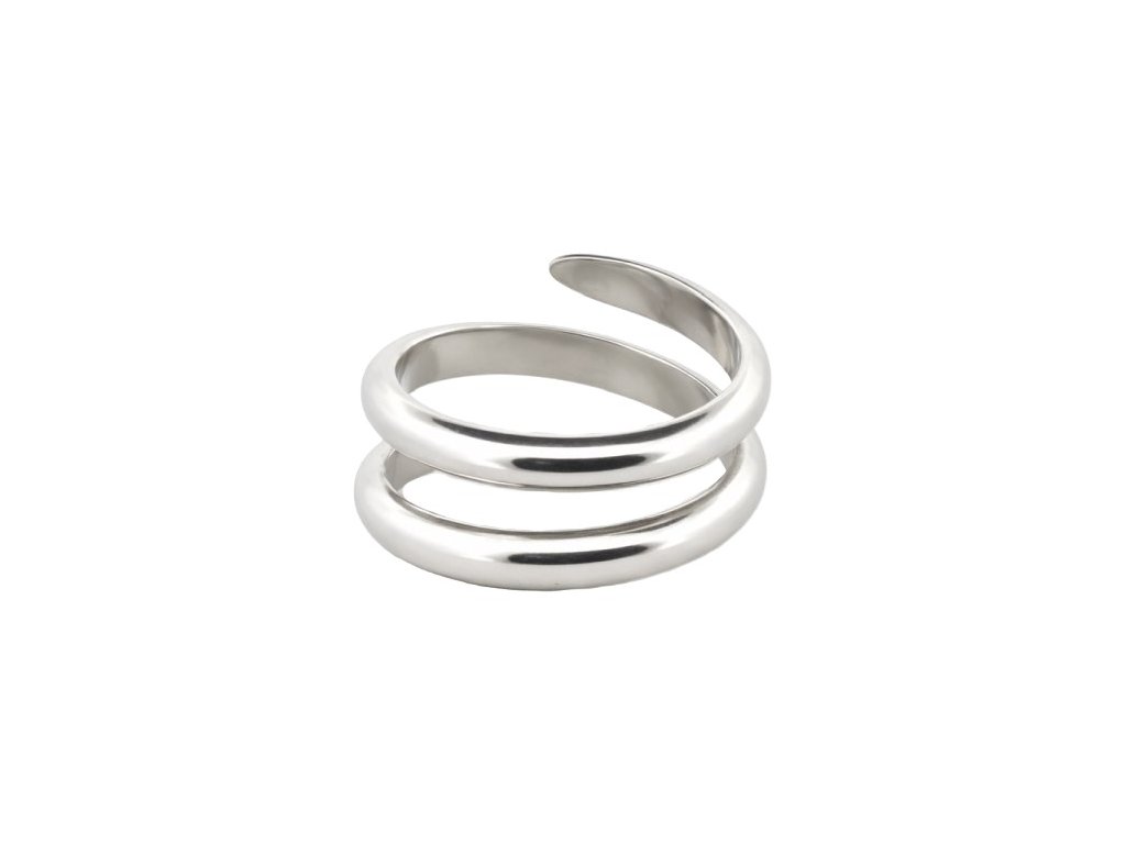 Prsteň má leštený strieborný povrch a otvorený tvar v podobe špirály, ktorý pôsobí vzdušne a moderne. Plynulé línie dodávajú šperku ľahkosť a čistý vizuálny dojem. Vďaka minimalistickému spracovaniu je vhodný na samostatné nosenie aj vrstvenie s ďalšími prsteňmi.
