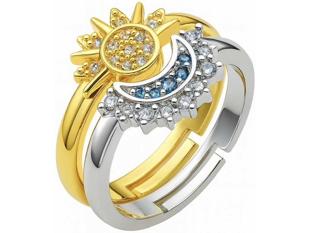 Elegantný dámsky set prsteňov v zlatej a striebornej farbe, zdobený symbolmi Slnka a Mesiaca so žiarivými zirkónmi. Dokonalé spojenie svetla a noci v jednom šperku.