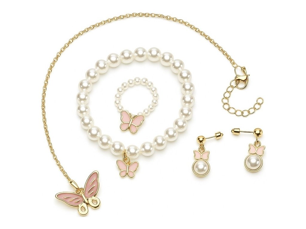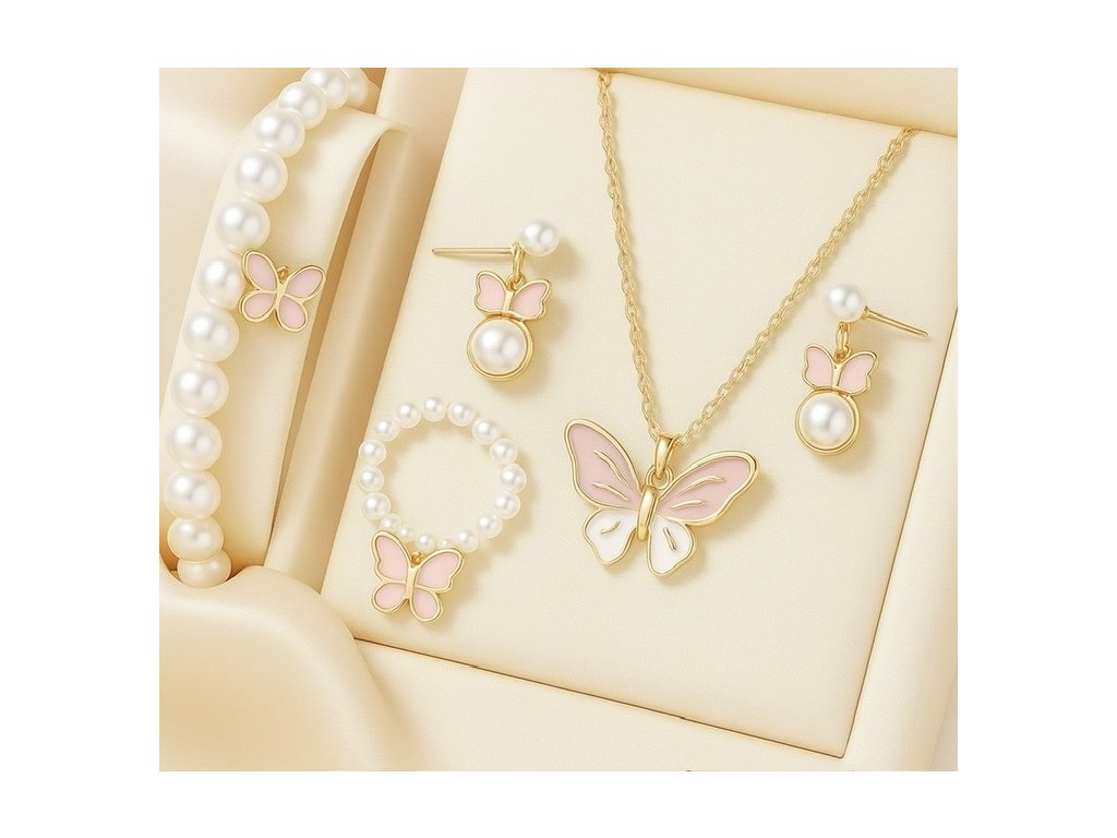 Set Papiloria spája jemnú ružovú a zlatú farbu v podobe motýľa – symbolu slobody a krásy. Obsahuje náhrdelník, náušnice, náramok a prstienok s perlami, ktoré dodajú každému outfitu dievčenský pôvab a eleganciu.