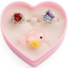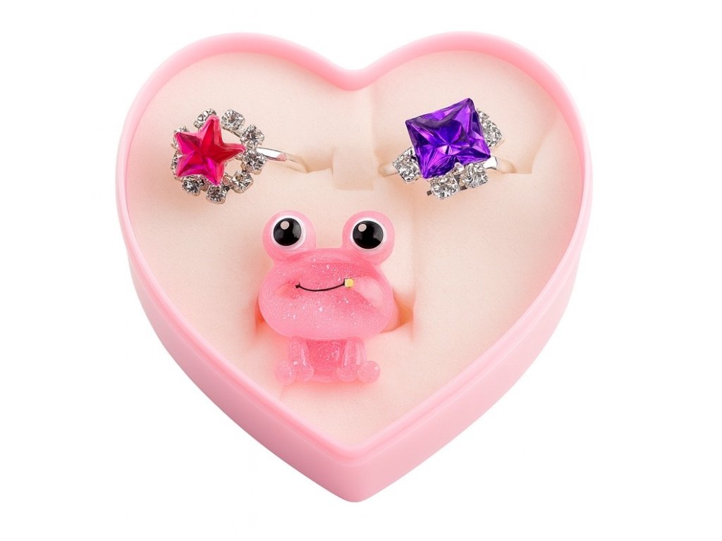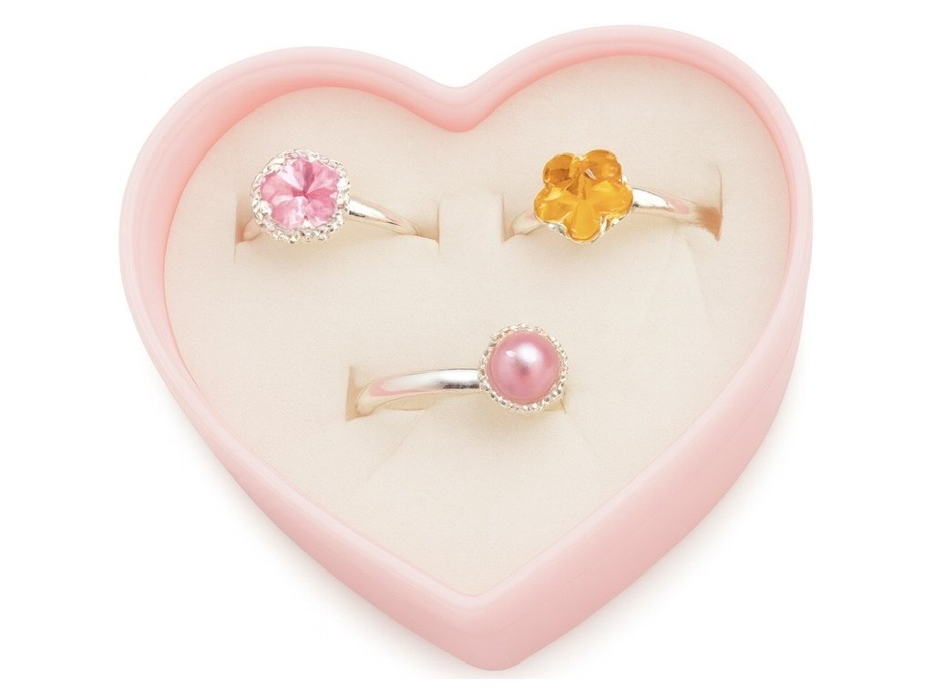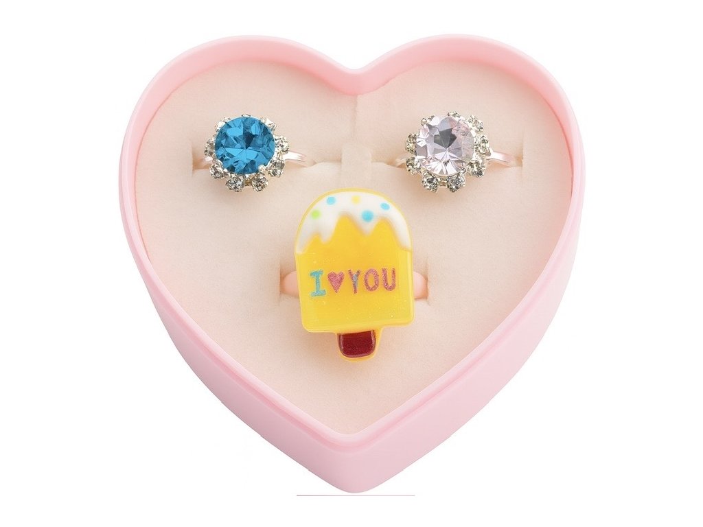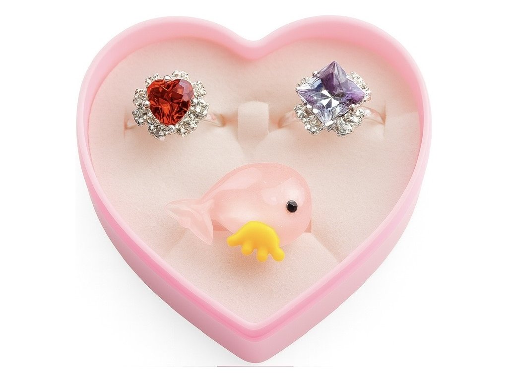 Rozkošné detské sady prstienkov v srdiečkových boxoch. Každý set obsahuje tri originálne prstienky so žiarivými kamienkami alebo hravými tvarmi. Ideálny darček pre malé princezné.