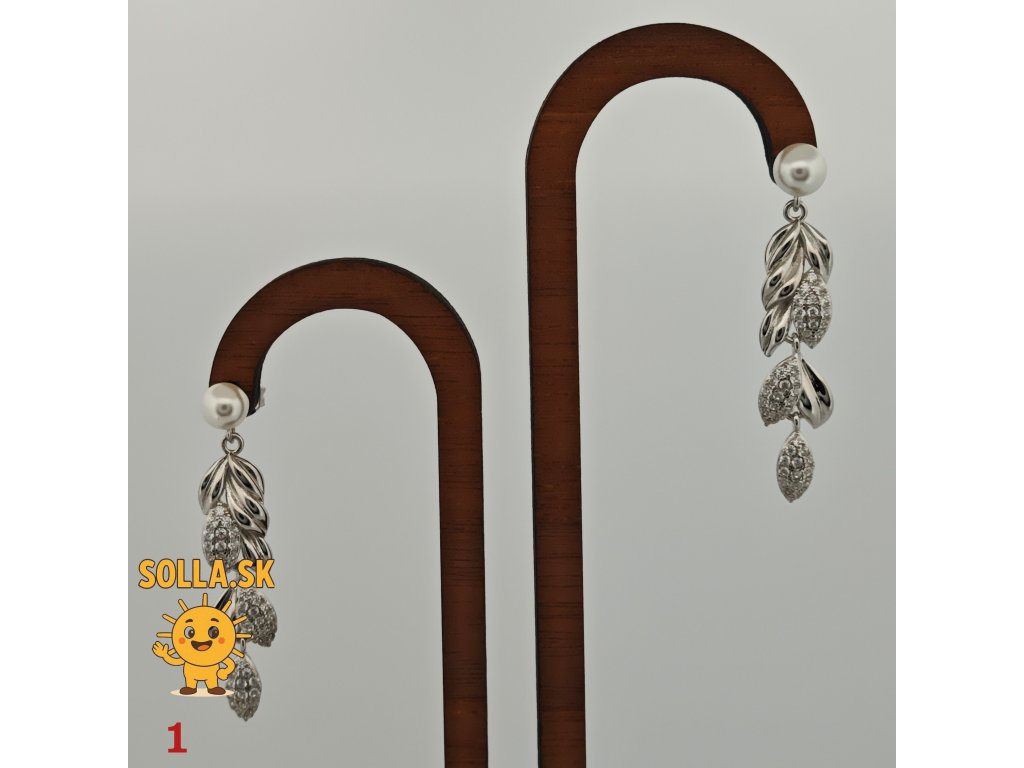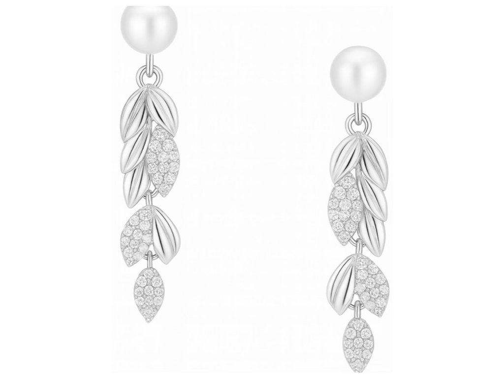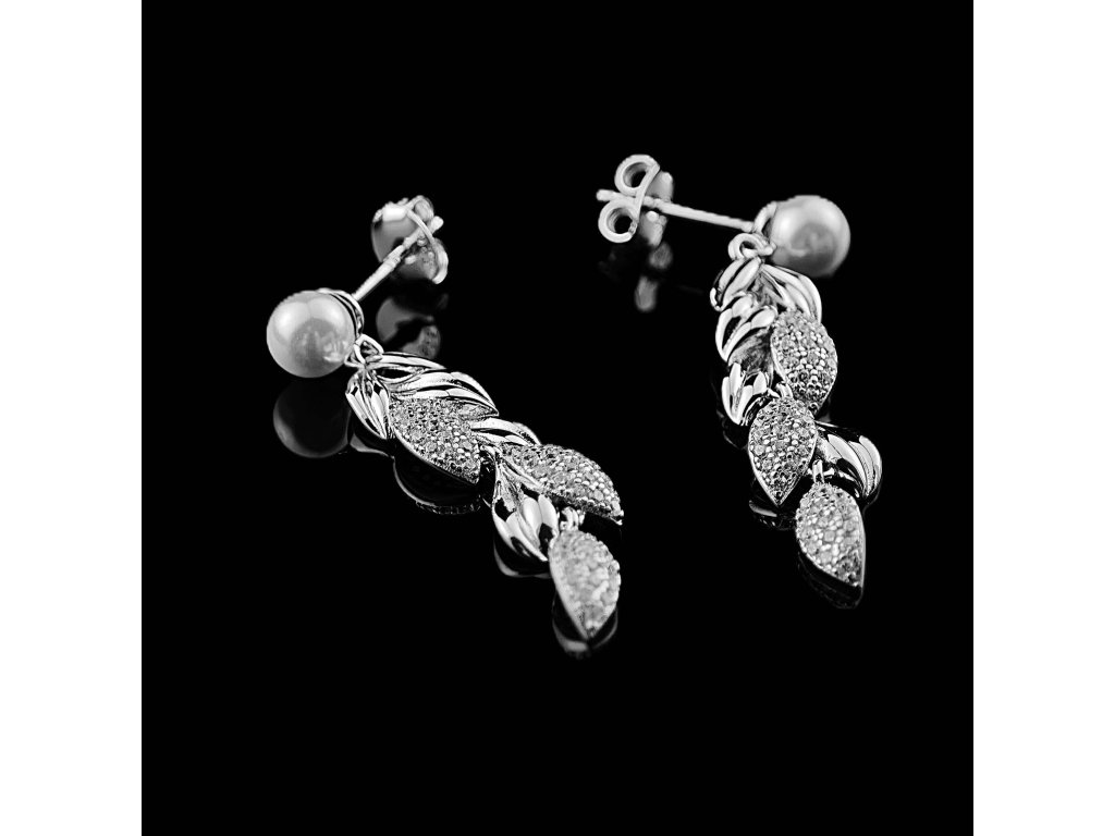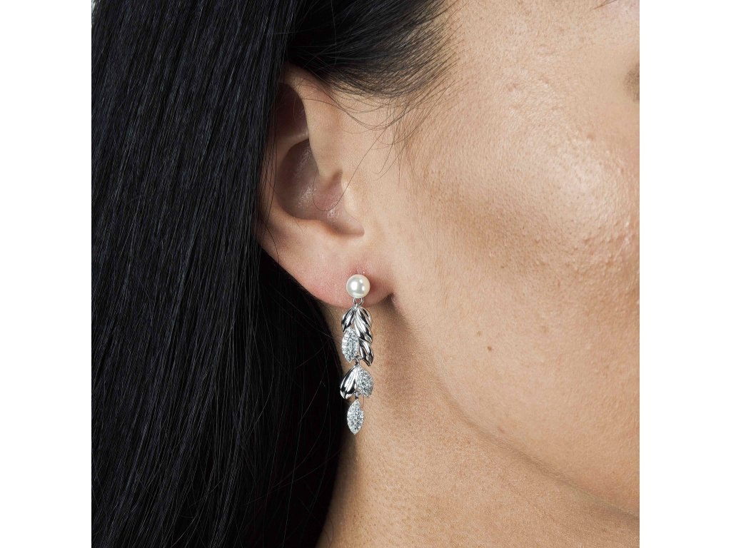Strieborné náušnice Lacrima Nymphae zo striebra 925 s perlou a zirkónmi. Ich listovitý dizajn symbolizuje dotyk prírody, eleganciu a ženskú jemnosť.