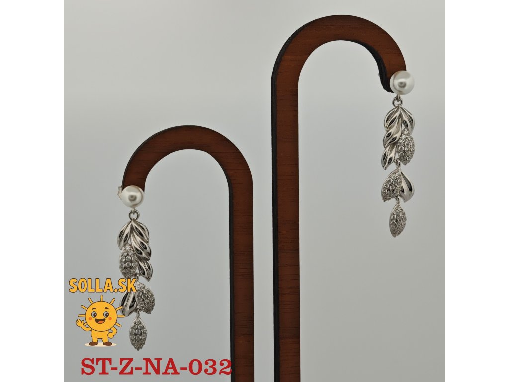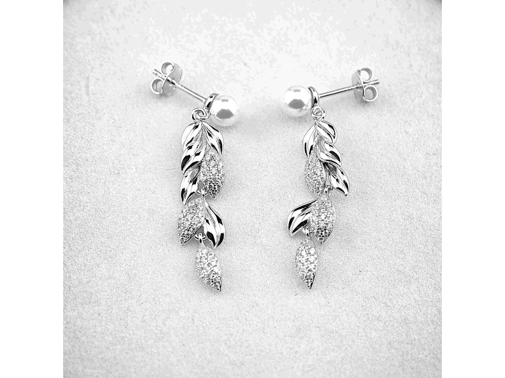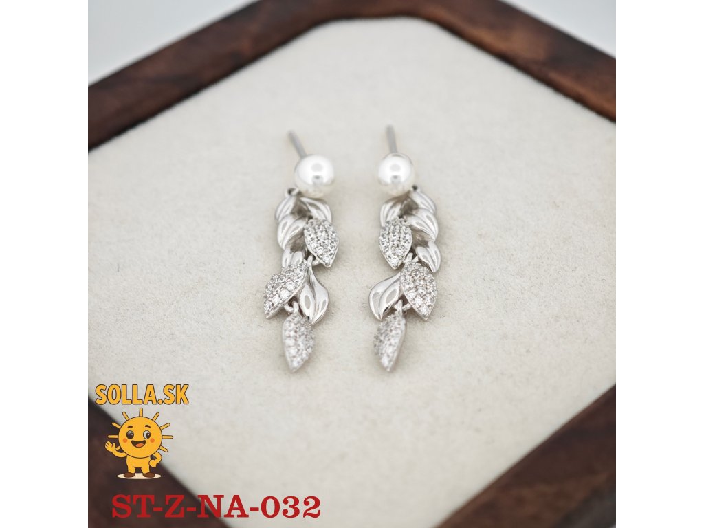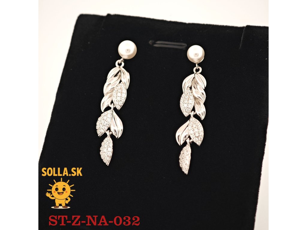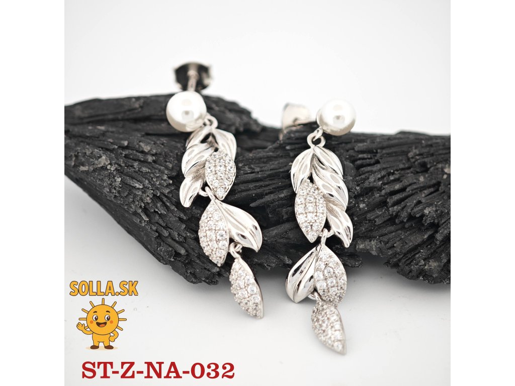 Strieborné náušnice Lacrima Nymphae zo striebra 925 s perlou a zirkónmi. Ich listovitý dizajn symbolizuje dotyk prírody, eleganciu a ženskú jemnosť.