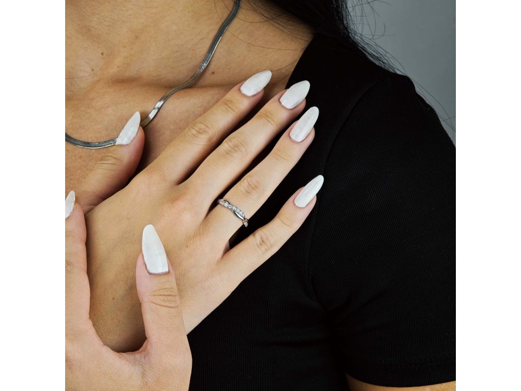 Elegance je prsteň vyrobený z pravého striebra 925 a zušľachtený 2-mikrónovou vrstvou rhódia bez obsahu niklu, ktorá chráni pred oxidáciou a dodáva trvalý lesk.