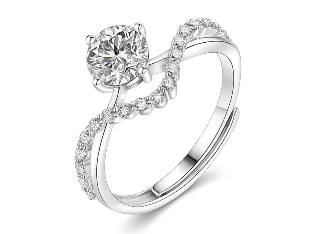 Elegantný prsteň s centrálnym žiarivým kameňom a jemne prepleteným pásom osadeným zirkónmi. Symbol večnej krásy, pôvabu a ženskosti.