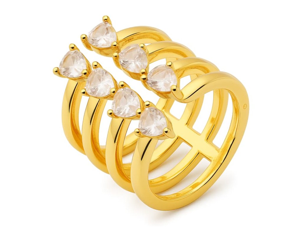 Golden Cascade je elegantný prsteň, ktorý kombinuje luxusný zlatý dizajn s iskrivými zirkónmi v tvare srdiečok. Symbolizuje ženskosť, eleganciu a jemnosť v každom detaile.