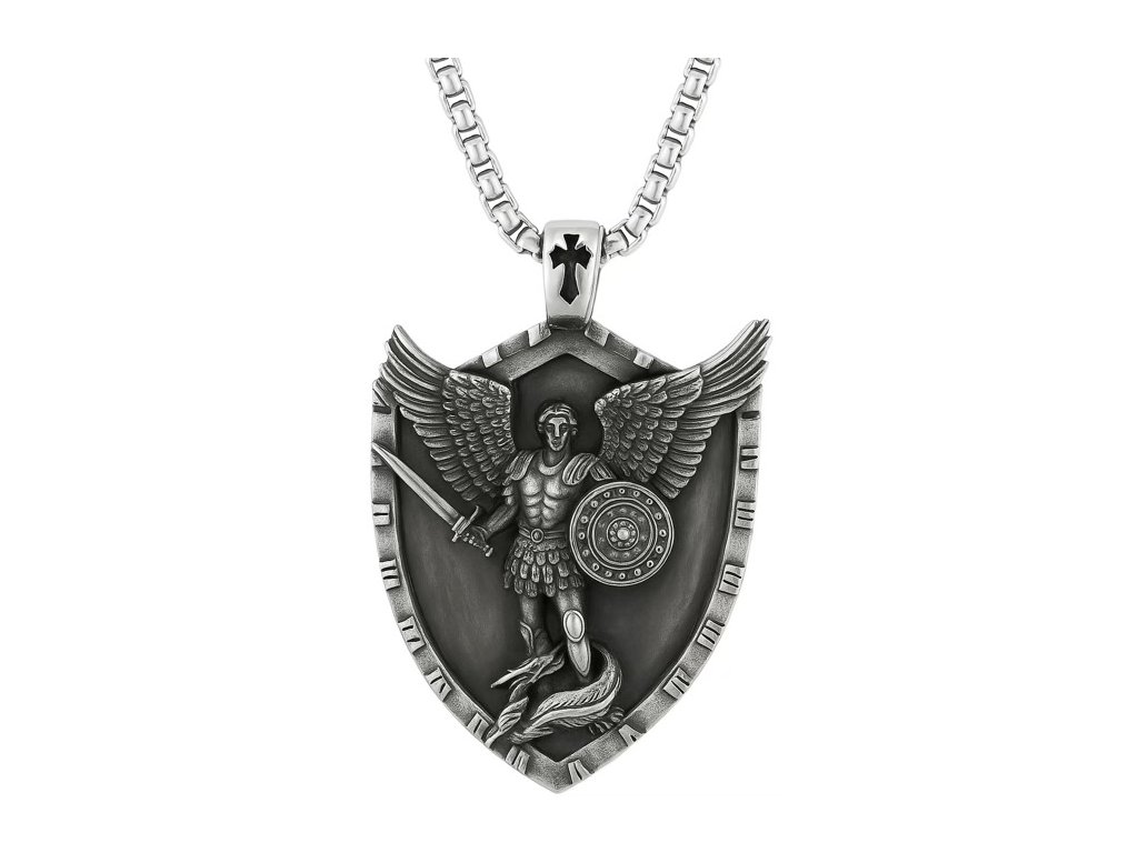 Guardian Angel – Anjelský ochranca je výnimočný šperk, ktorý v sebe nesie hlboký význam a silu. Tento masívny prívesok v tvare štítu zobrazuje okrídleného bojovníka s mečom a štítom – anjela, ktorý chráni, vedie a symbolizuje víťazstvo dobra nad zlom. Jeho majestátny postoj a detaily brnenia vyjadrujú odvahu, odhodlanie a silu ducha.